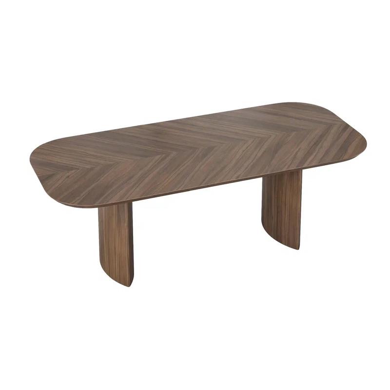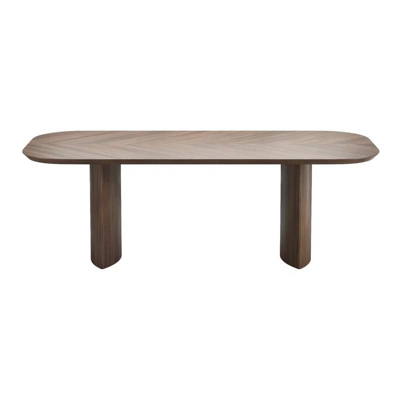 Актуальный обеденный стол в современном стиле является центром столовой. Акцентная выкладка шпона узором Chevron на столешнице делают эту модель уникальной. Рисунок натурального шпона всегда индивидуален. Форма столешницы - мягкий квадрат делает стол максимально эргономичным и безопасным . Столешница и ноги стола выполнены из высококачественного, сертифицированного МДФ высокой плотности. Отделка – натуральный шпон северо-американского ореха. Стол фиксированный, не раскладной. За столом комфортно разместится 8-10 человек.