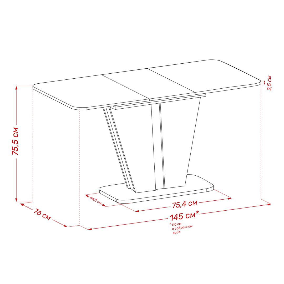 Для ежедневного приёма пищи достаточно небольшого стола. А раздвижной стол — лучшее решение на случай гостей. В разложенном состоянии за ним может с комфортом разместиться до 6 человек. Массивная опора в виде перевёрнутой трапеции придаёт «Бари» устойчивость и внушительный внешний вид. В разложенном виде, длина стола - 1450 мм.