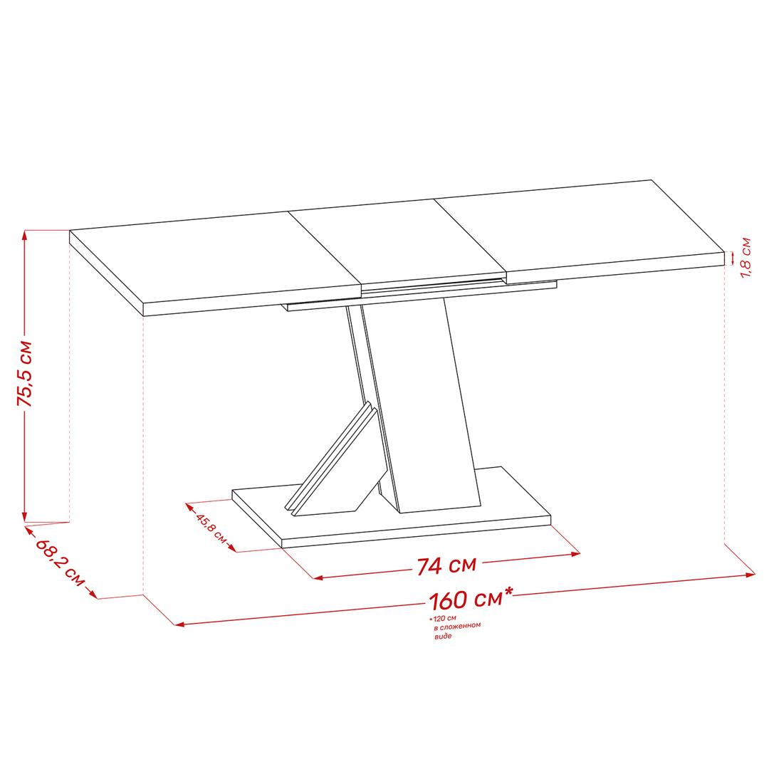 Размер столешницы в разложенном виде - 682x1600 мм.