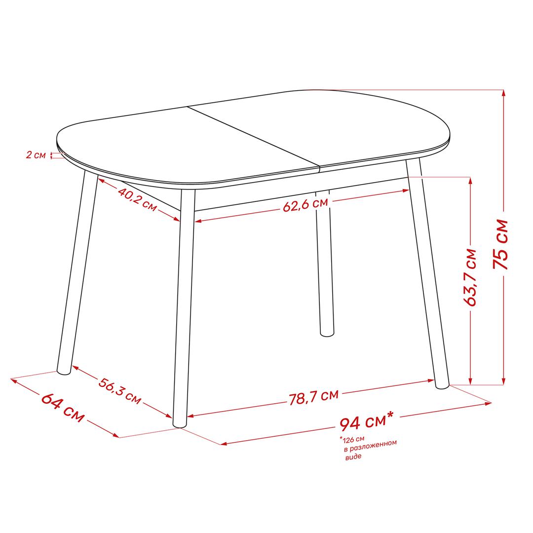 Размер столешницы в разложенном виде - 640x1260 мм.