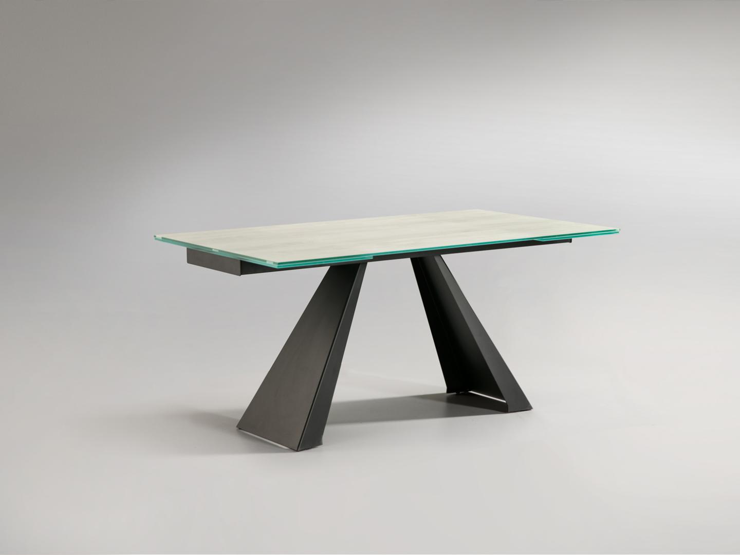 Раздвижной обеденный стол из металла с матовой черной отделкой и столешницей из закаленного стекла толщиной 10 мм с белыми прожилками и высокопрочным покрытием. Два выдвижных крыла на 40 см.