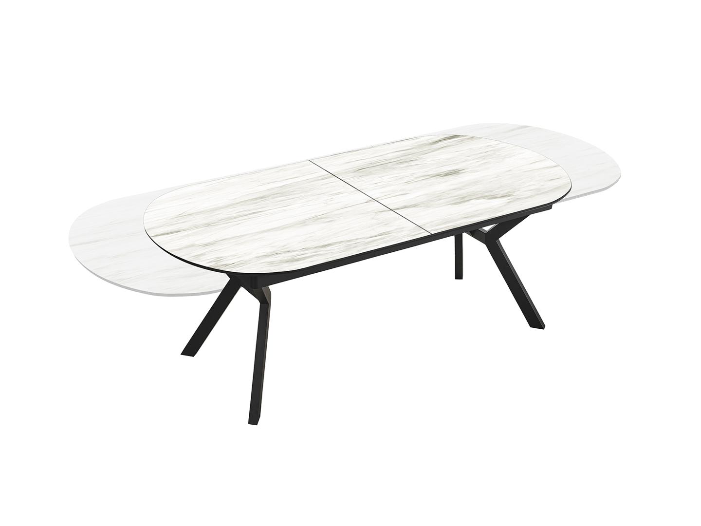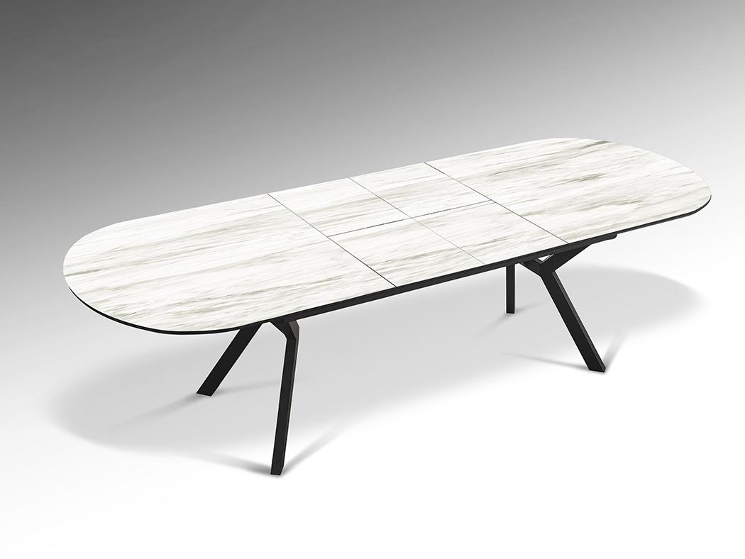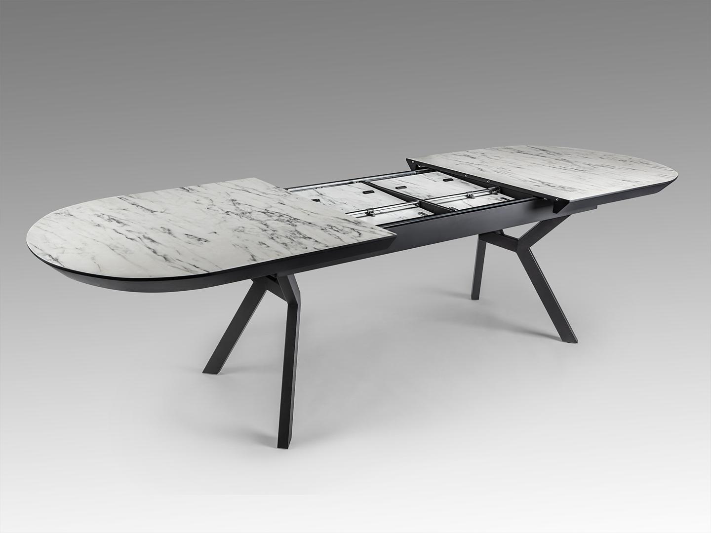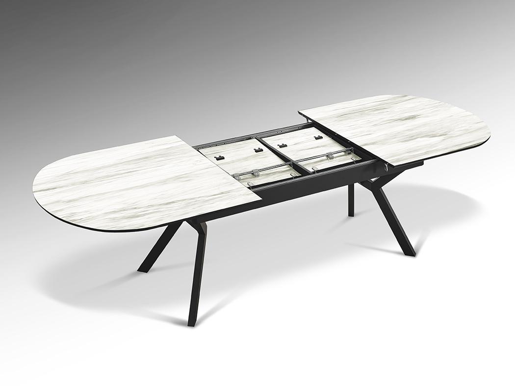 Раздвижной обеденный стол из металла с черной матовой отделкой и столешницей из МДФ с высокостойкой меламиновой поверхностью, глянцевой отделкой из белого мрамора, с черными матовыми краями. Расширяется до 2,85 метра.