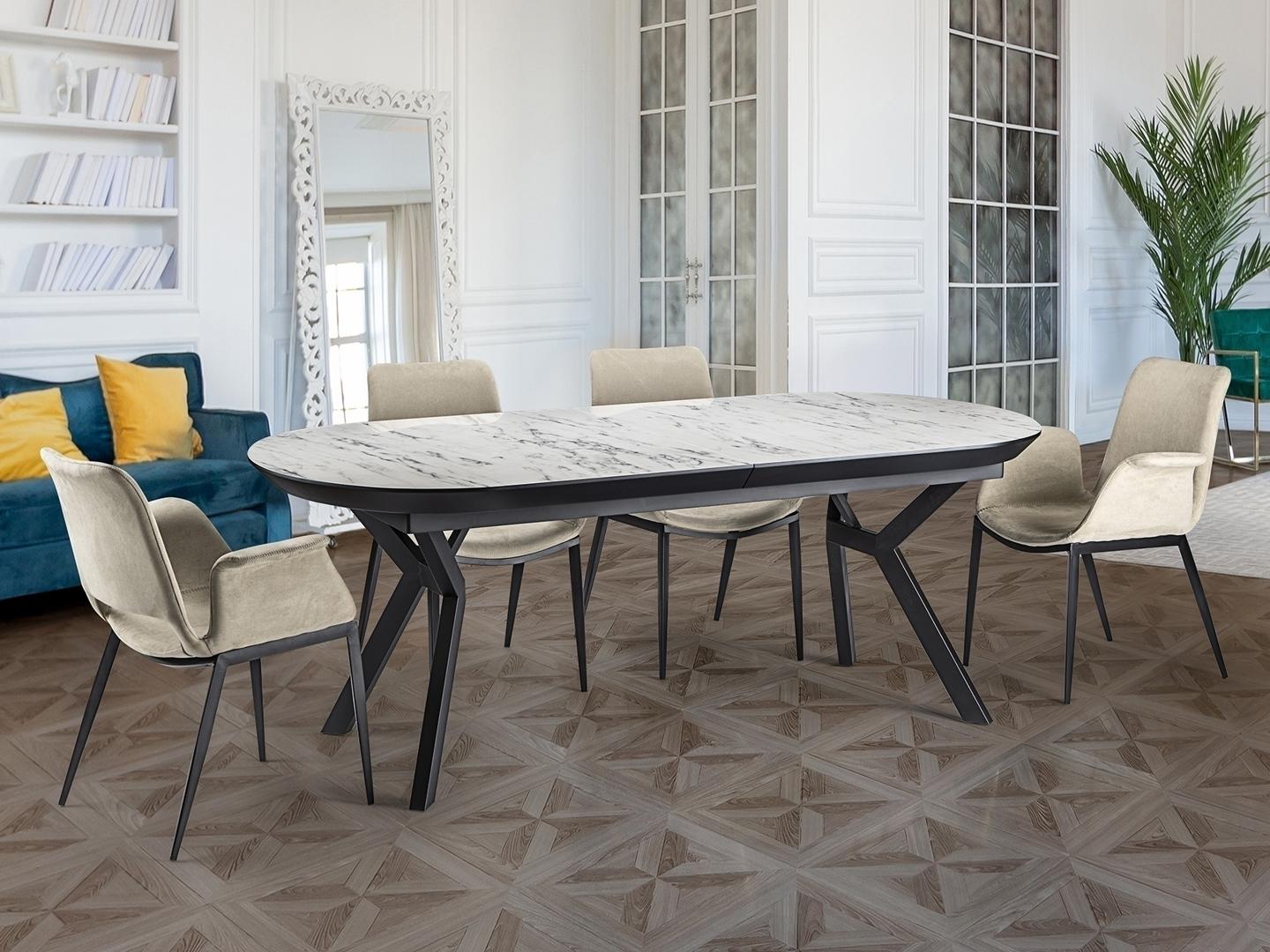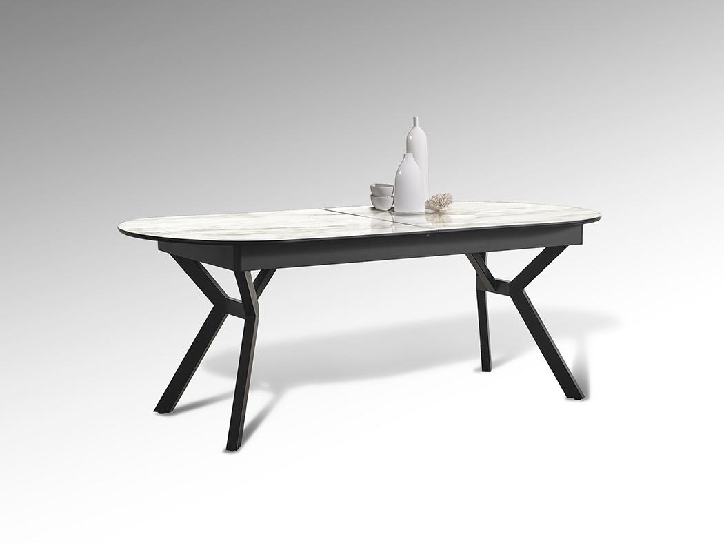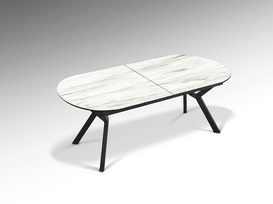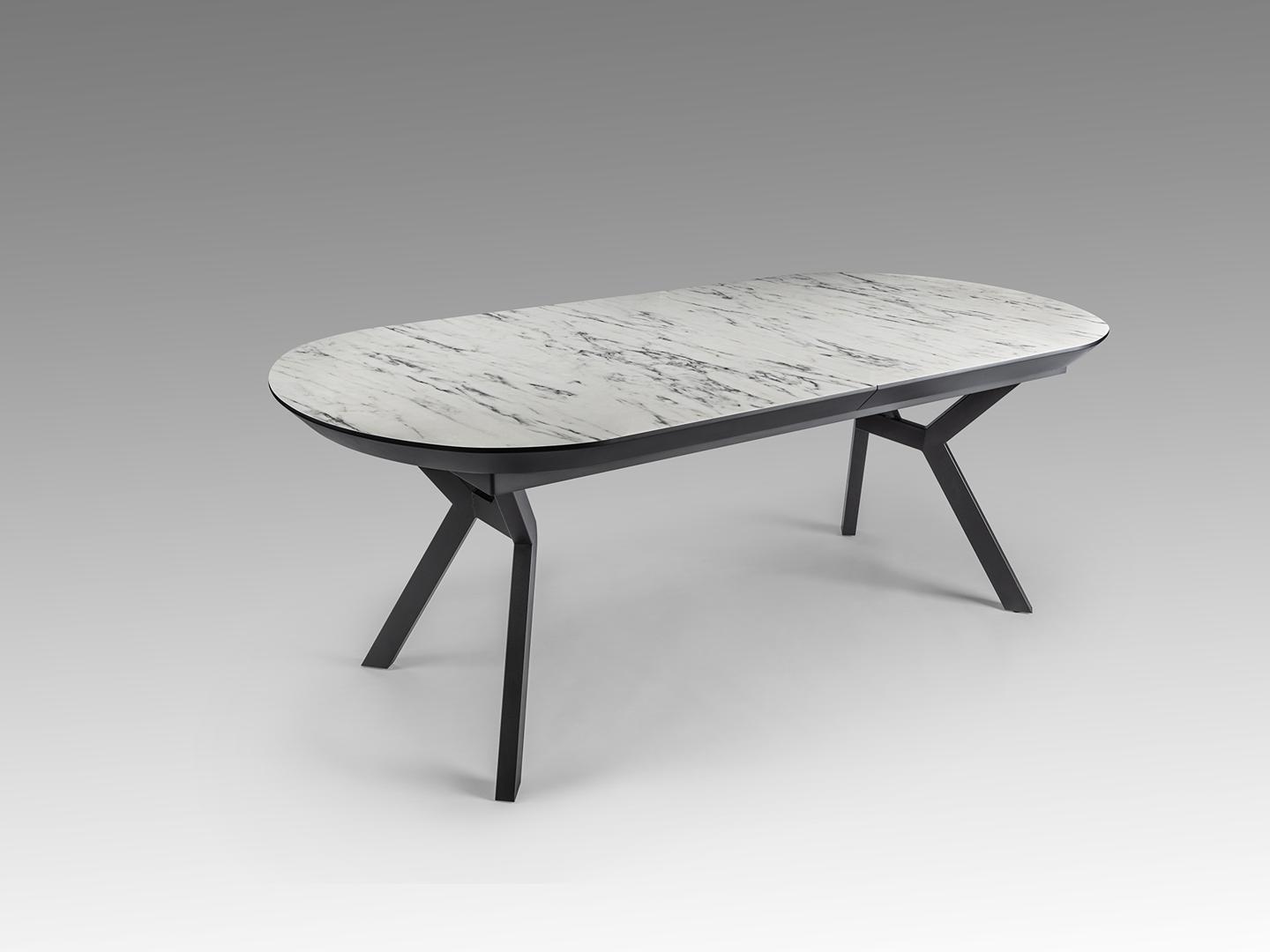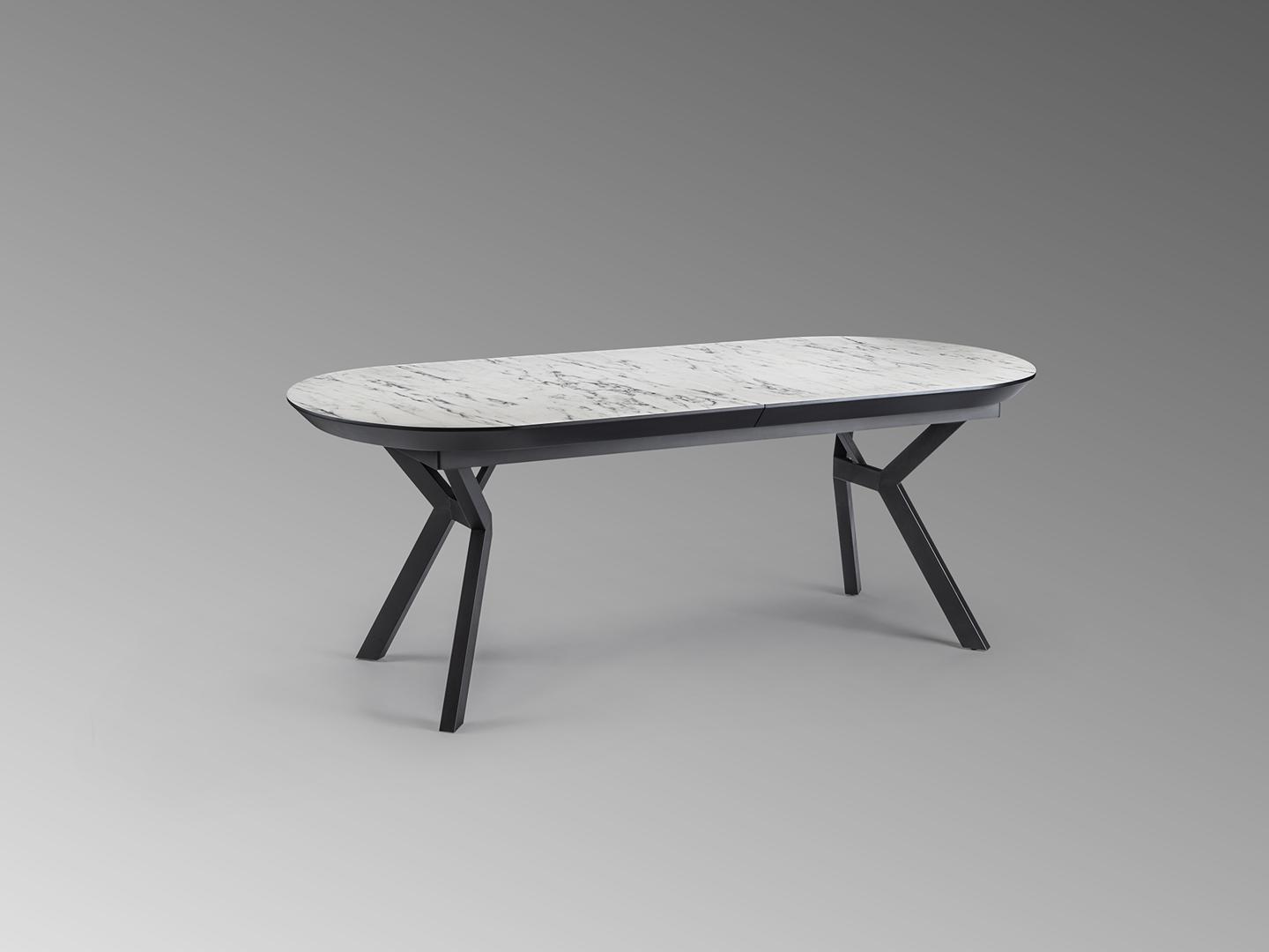Раздвижной обеденный стол из металла с черной матовой отделкой и столешницей из МДФ с высокостойкой меламиновой поверхностью, глянцевой отделкой из белого мрамора, с черными матовыми краями. Расширяется до 2,85 метра.
