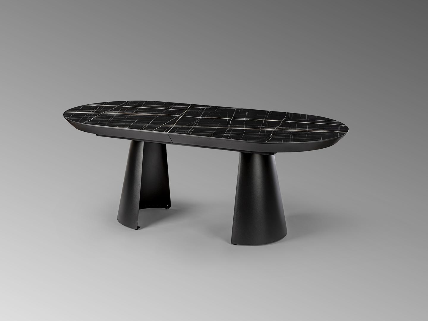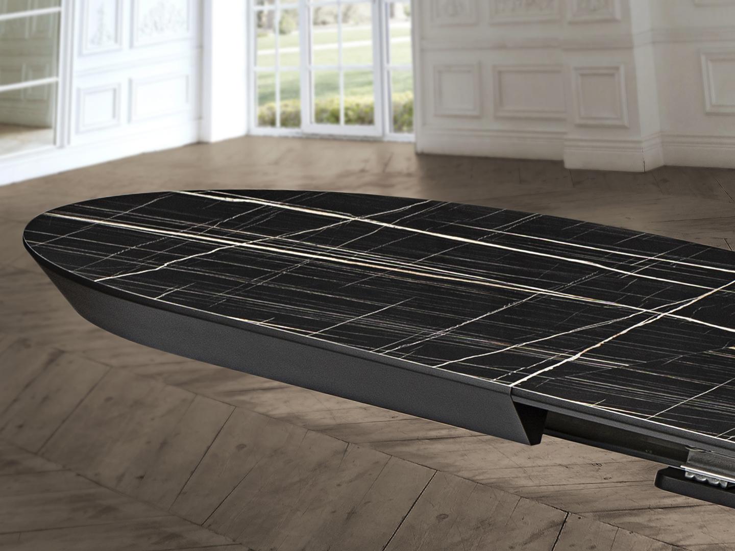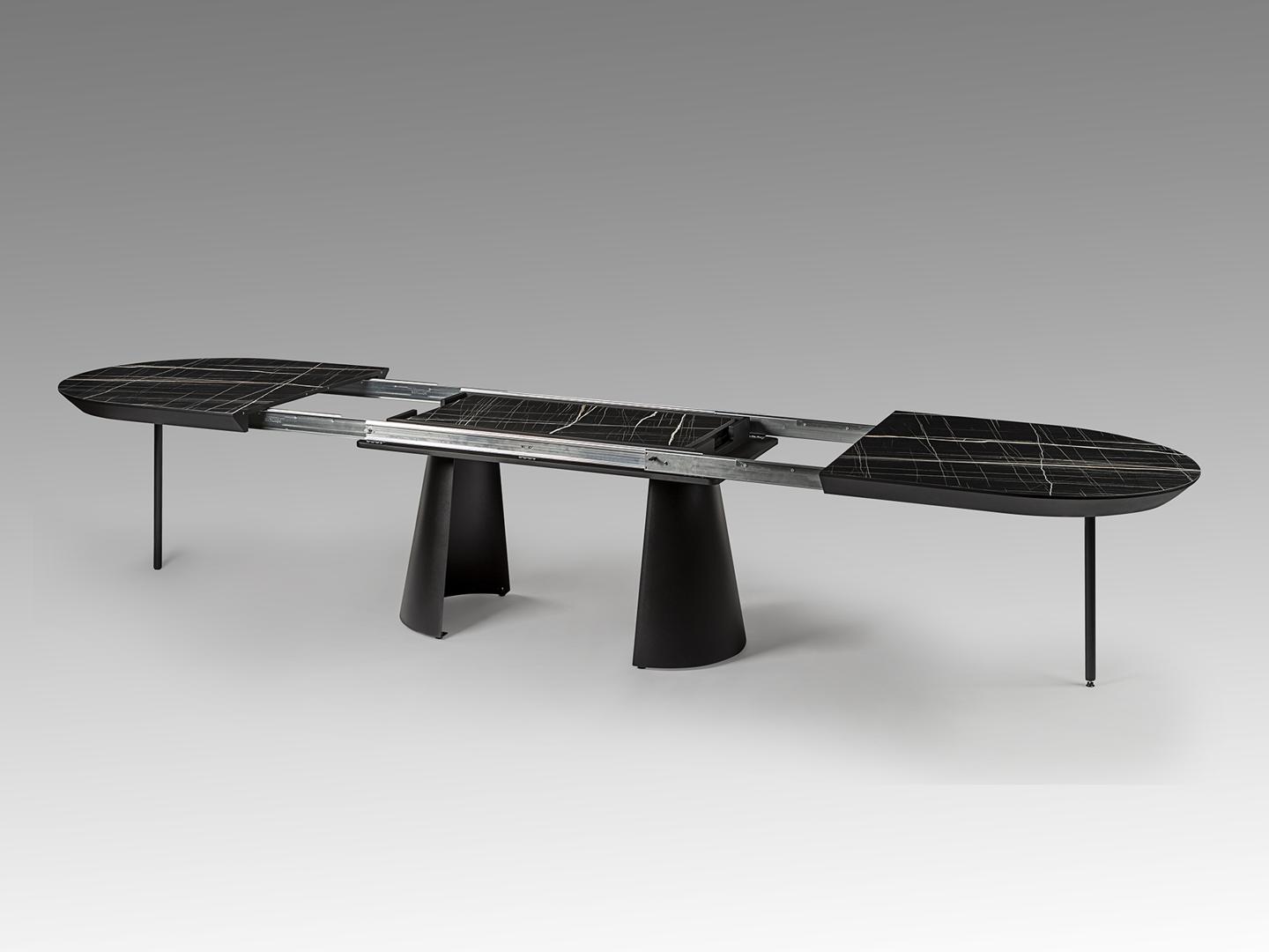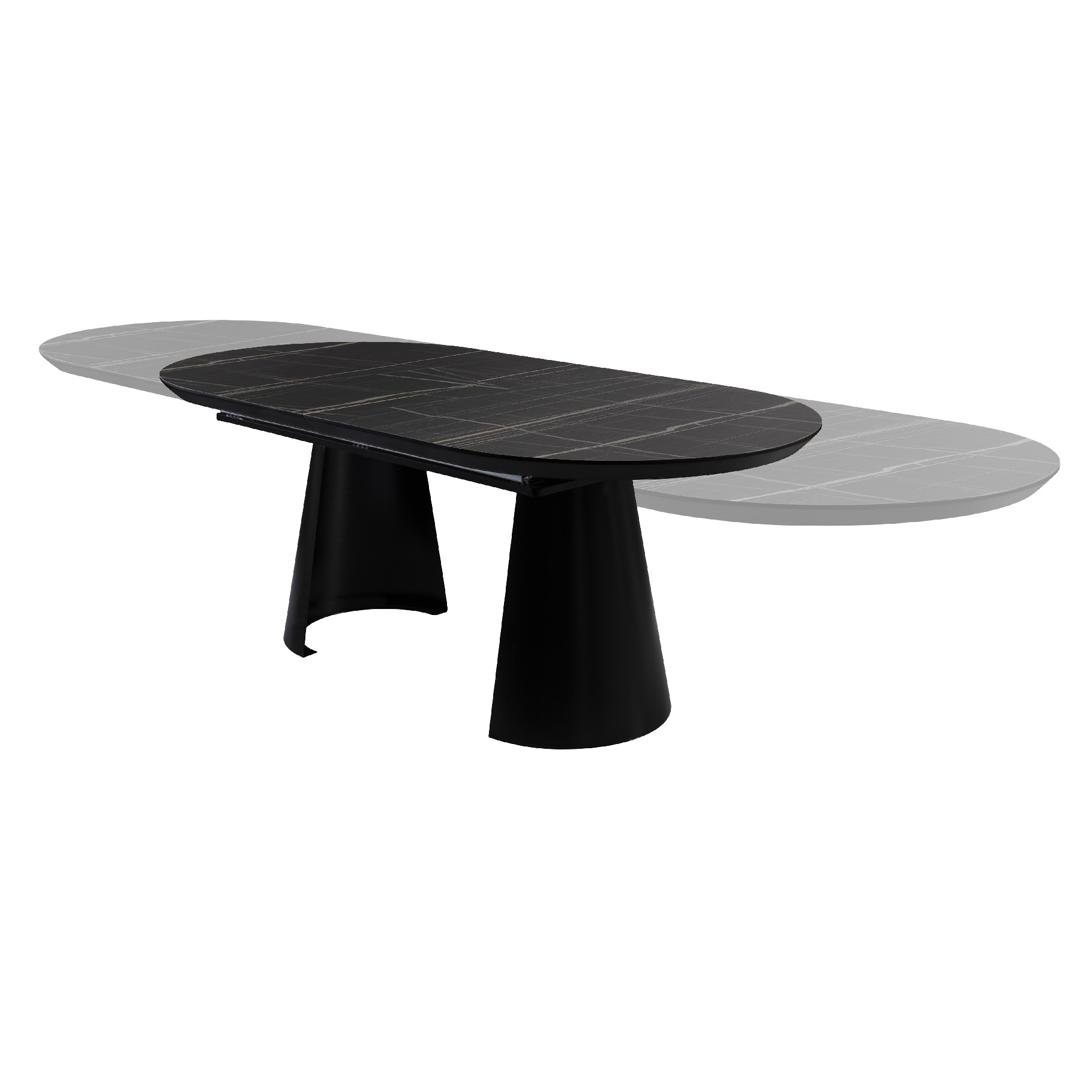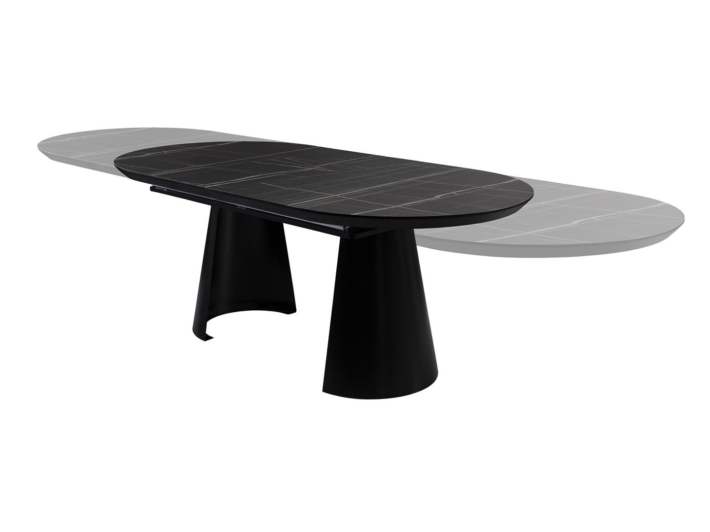 Раздвижной обеденный стол из металла с черной матовой отделкой и столешницей из МДФ с высокопрочной меламиновой поверхностью, отделкой из глянцевого черного мрамора, с черными матовыми краями. Удлиняется до 4 метров. В комплект входят 2 дополнительные ножки, исключающие легкую вибрацию верхней части при полном выдвижении.