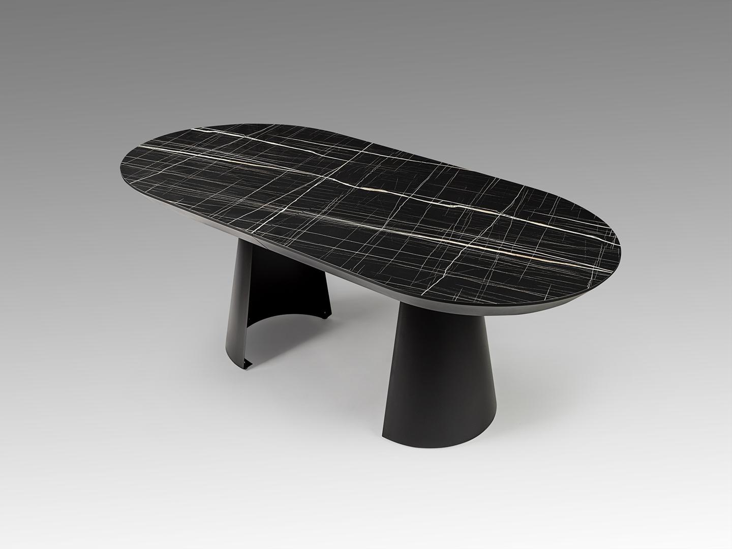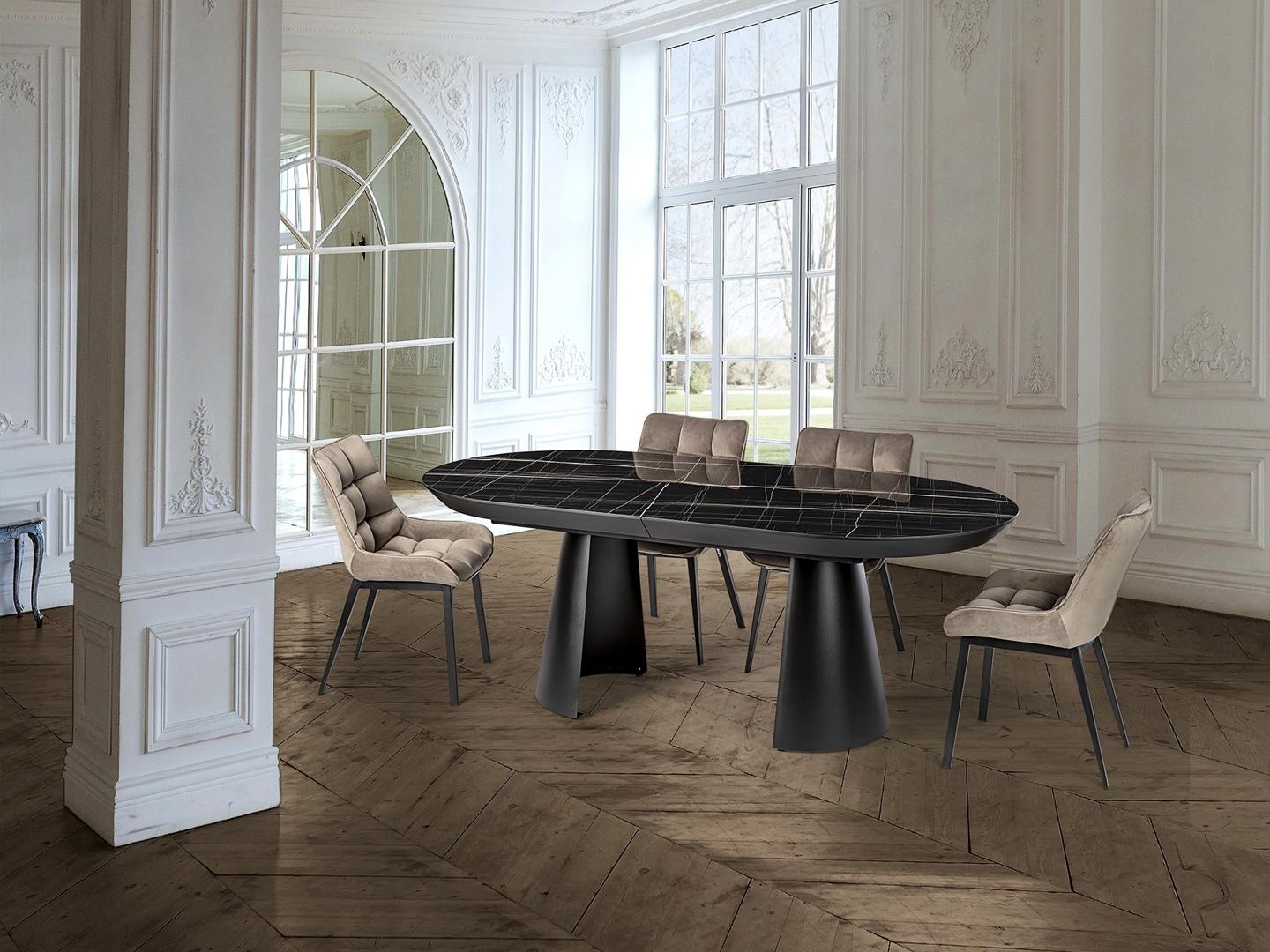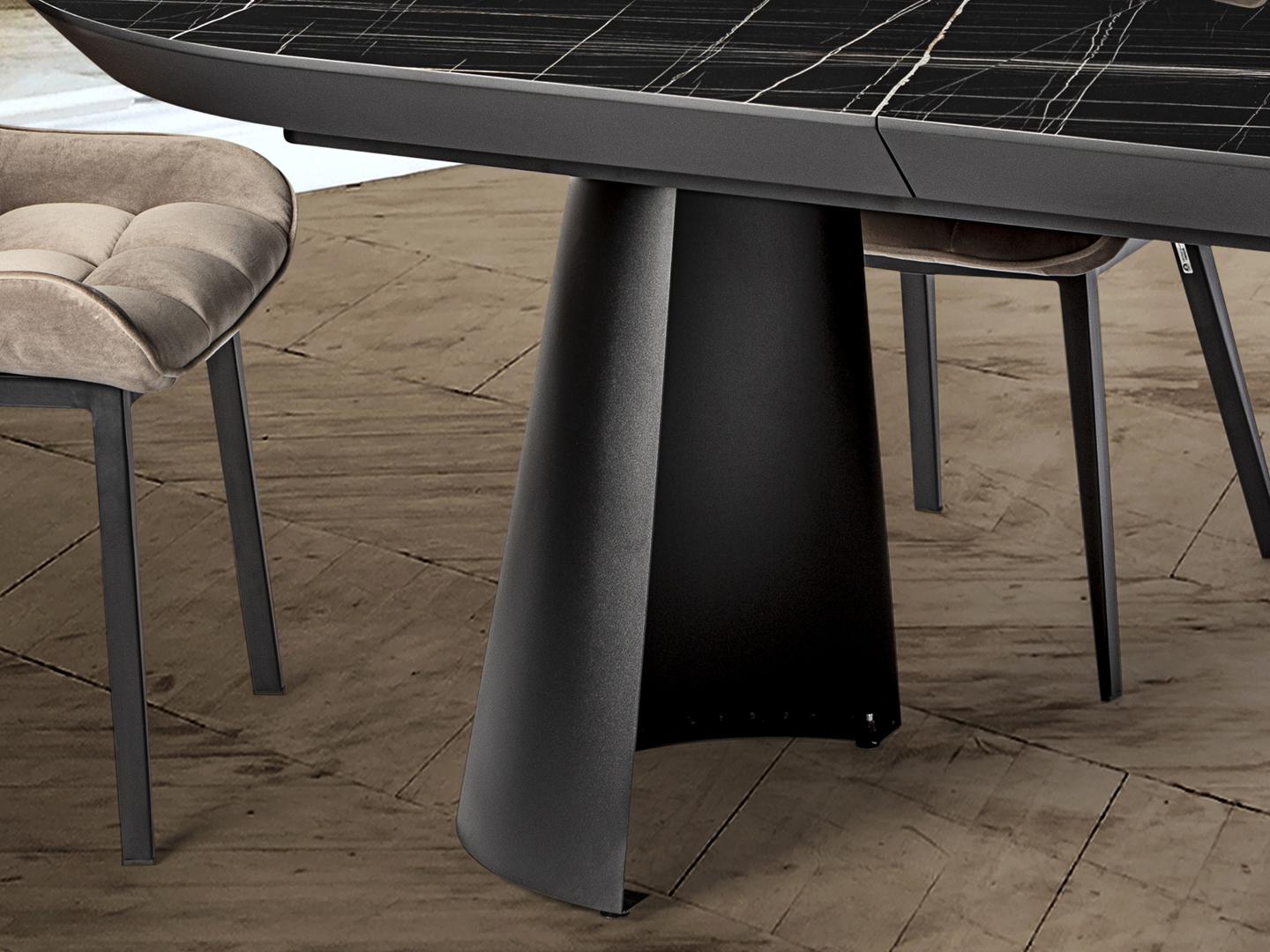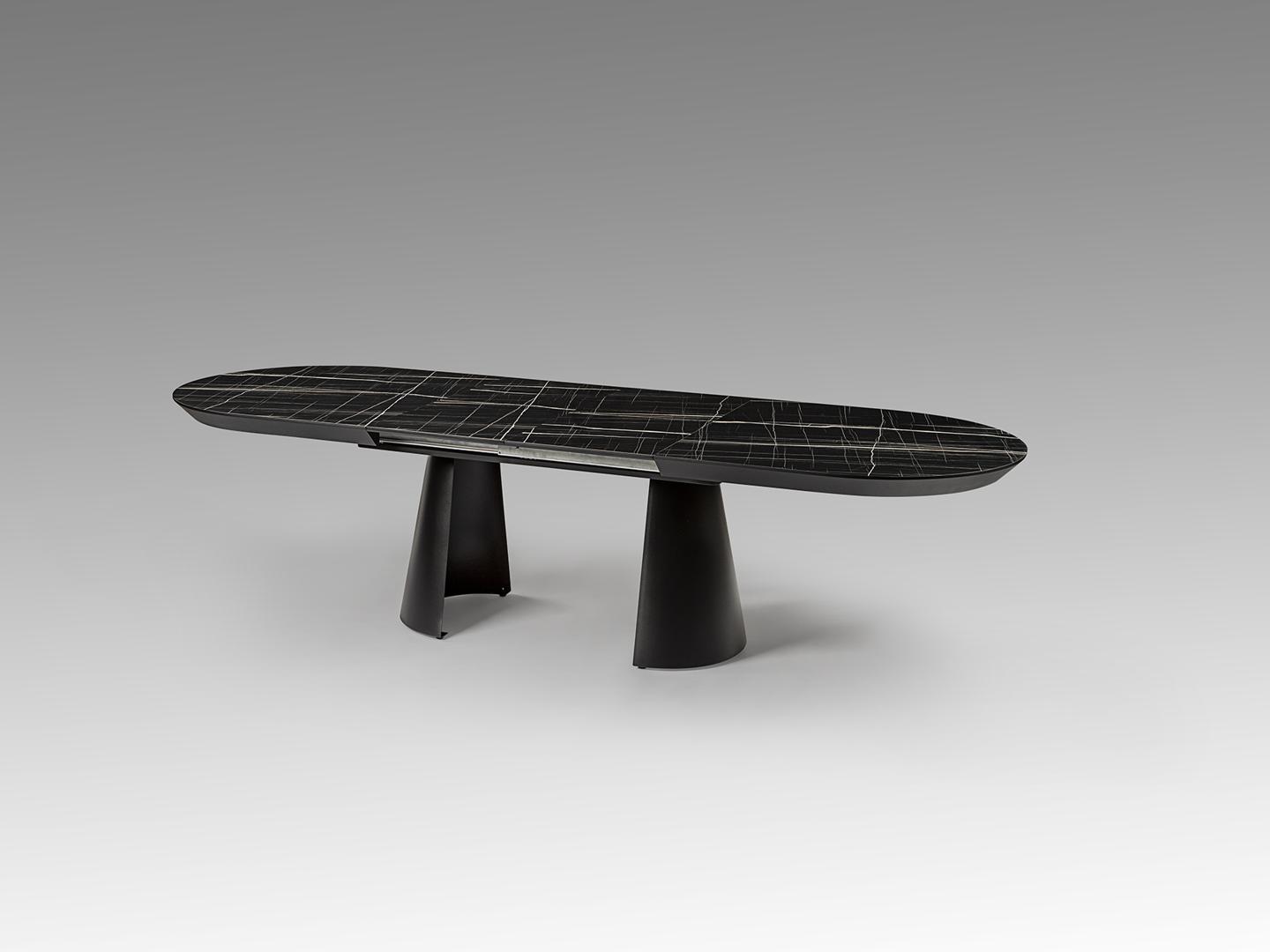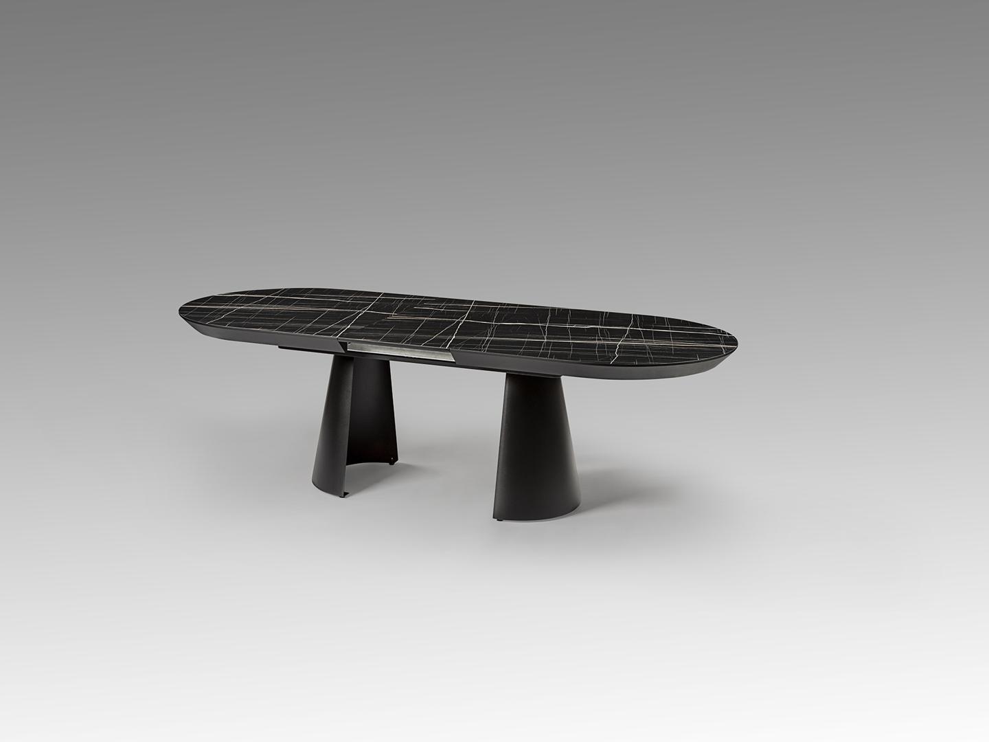 Раздвижной обеденный стол из металла с черной матовой отделкой и столешницей из МДФ с высокопрочной меламиновой поверхностью, отделкой из глянцевого черного мрамора, с черными матовыми краями. Удлиняется до 4 метров. В комплект входят 2 дополнительные ножки, исключающие легкую вибрацию верхней части при полном выдвижении.