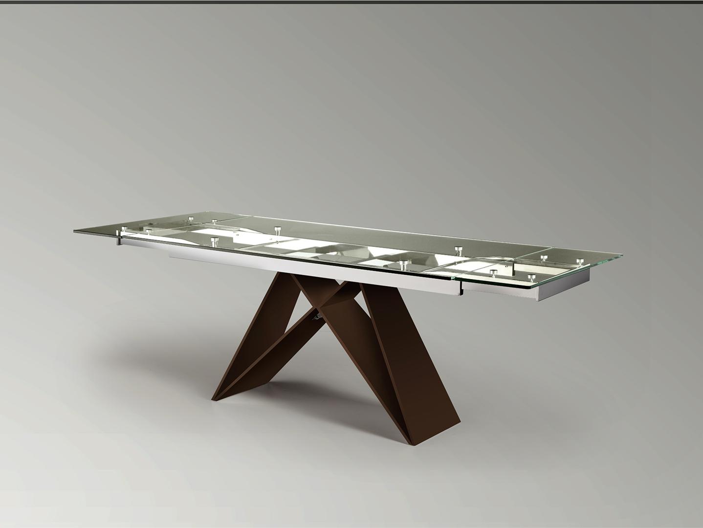 Обеденный стол раздвижной 160/220 см, изготовлен из нержавеющей стали, с глянцевой отделкой и основанием темно-коричневого оксида. Столешница из безопасного стекла толщиной 12 мм с полированным краем.