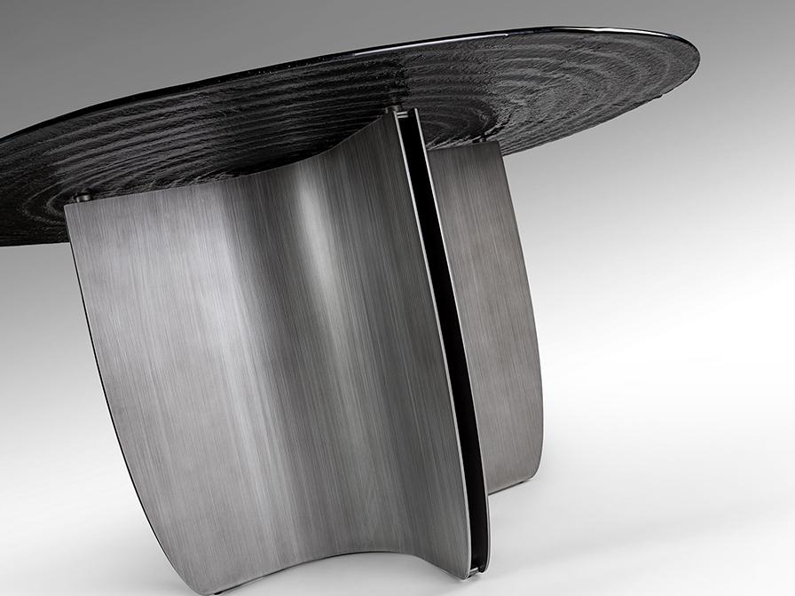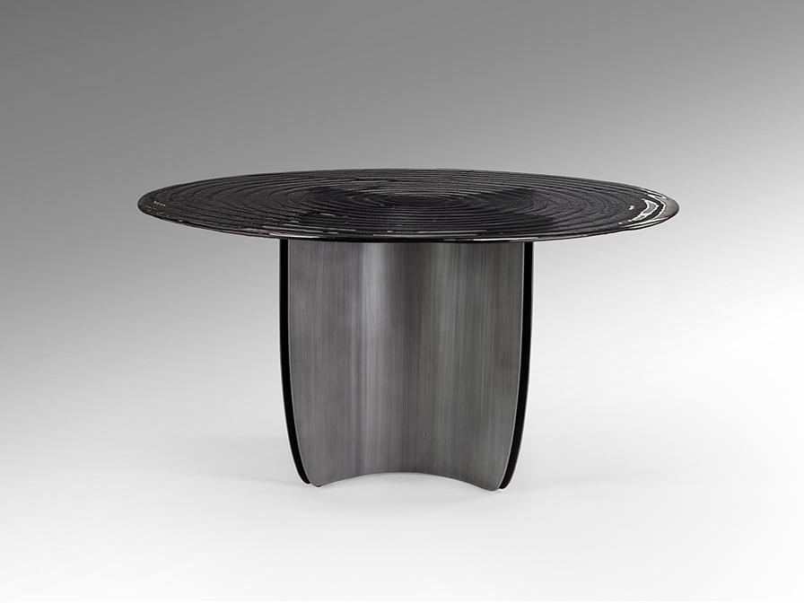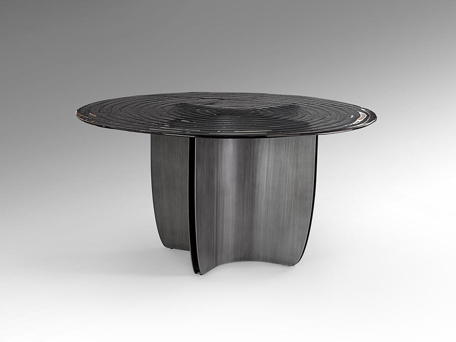 Круглый обеденный стол из металла с патинированной свинцово-серой отделкой. Столешница из серого термоформованного стекла с текстурой концентрических волн.