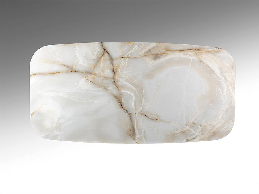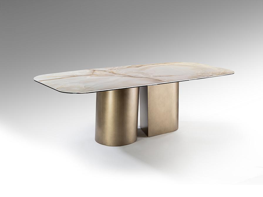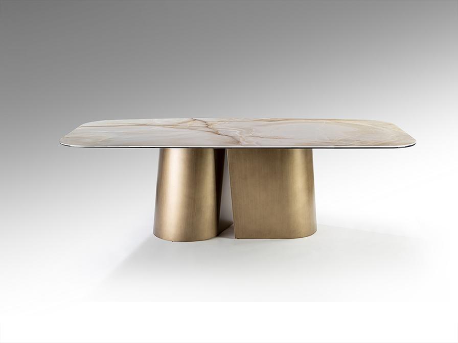 Обеденный стол из металла с отделкой из матовой латуни. Столешница из ламинированного фарфора и стекла с декором из прожилок мрамора.