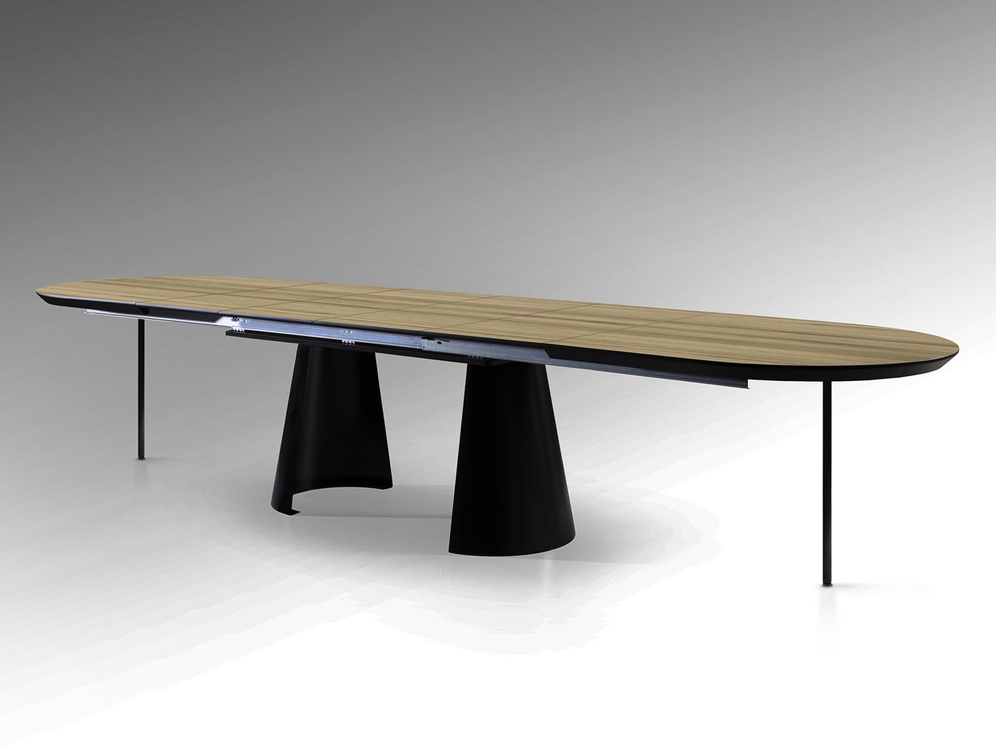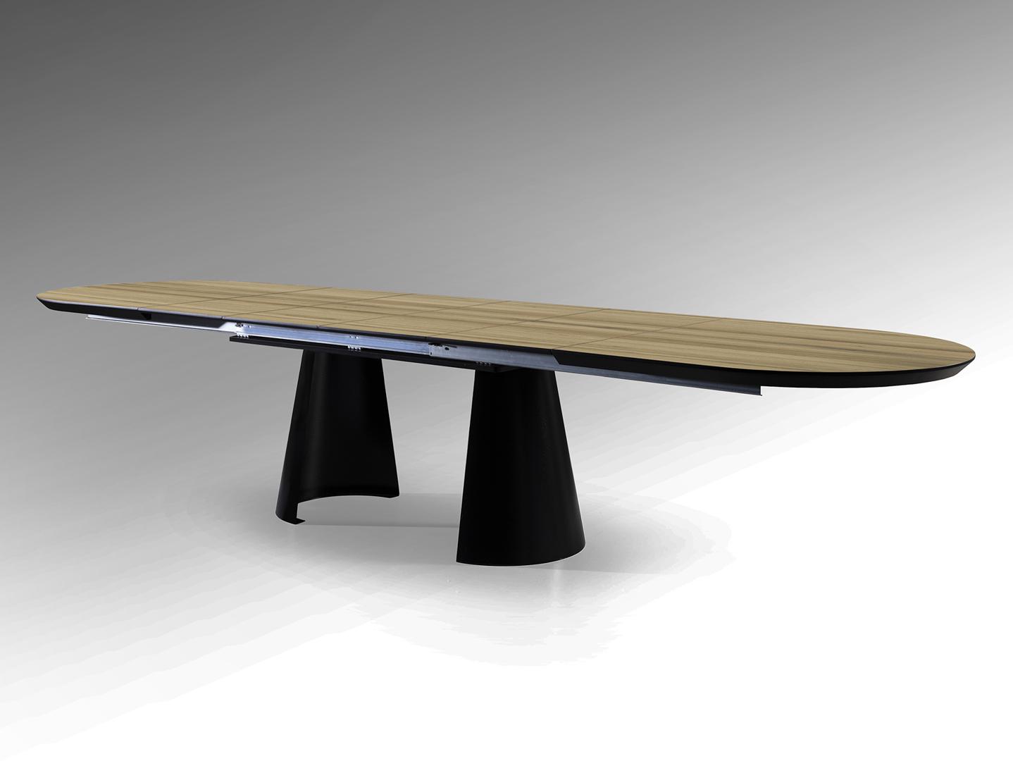 Раздвижной обеденный стол из металла с черной матовой отделкой и столешницей из МДФ с высокостойкой меламиновой поверхностью, отделкой под дерево, с черными матовыми краями. Удлиняется до 4 метров. В комплект входят 2 дополнительные ножки, исключающие легкую вибрацию верхней части при полном выдвижении.