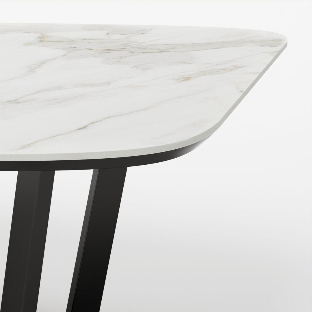 Овальный стол BENZ - отличается своей дизайнерской опорой и изысканной керамической столешницей. Керамическое покрытие стола не боится влаги, устойчиво к перепадам температур, на нем можно резать продукты без использования кухонной доски. Рисунок каждой столешницы уникален. Белая с серо-бежевыми прожилками. В хаотичных узорах можно найти разнообразные формы, либо воспринимать их как абстракции. За данным столом легко поместится 6 человек. Опора привлекает своей оригинальностью. Также она сделана из стали - это долговечный и крепкий материал.
