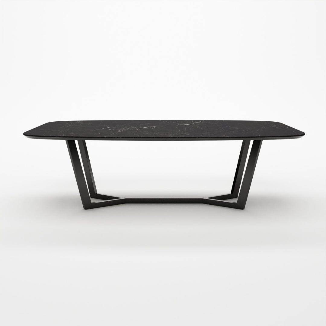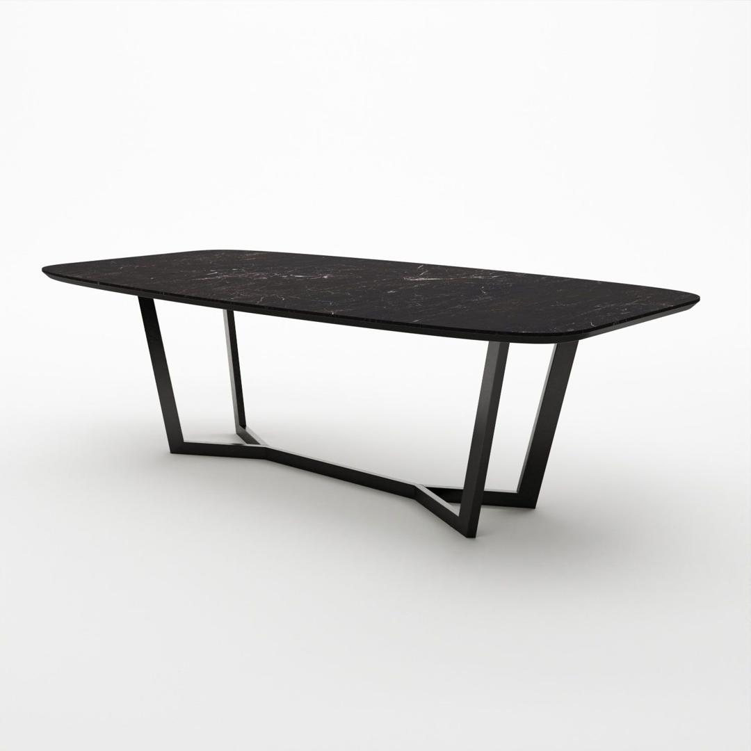 Овальный стол BENZ - отличается своей дизайнерской опорой и изысканной керамической столешницей. Керамическое покрытие стола не боится влаги, устойчиво к перепадам температур, на нем можно резать продукты без использования кухонной доски. Рисунок каждой столешницы уникален. Черный вариант имеет светлые вкрапления и линии. В хаотичных узорах можно найти разнообразные формы, либо воспринимать их как абстракции. За данным столом легко поместится 6 - 8 человек. Опора привлекает своей оригинальностью. Также она сделана из стали - это долговечный и крепкий материал.