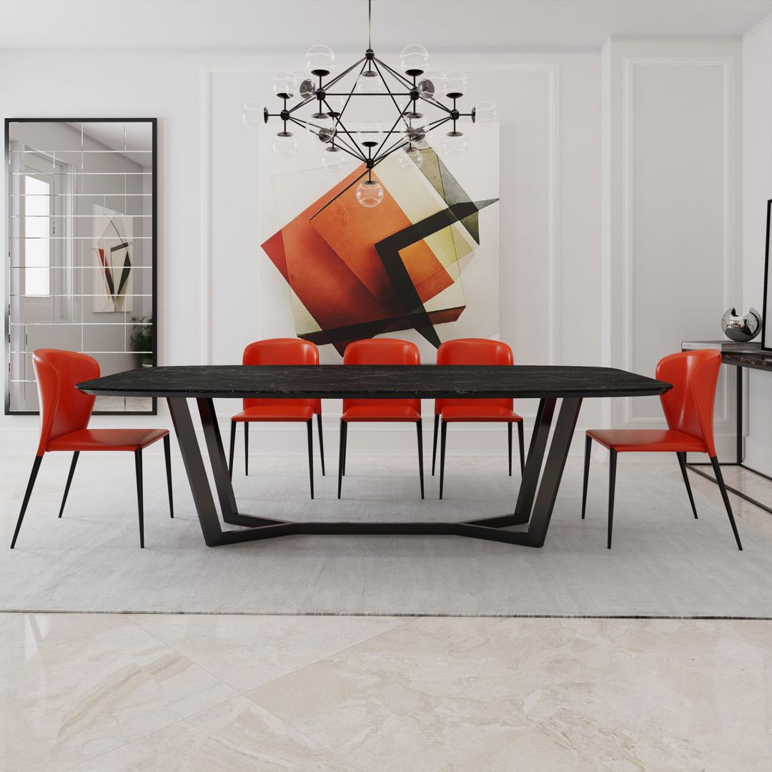 Овальный стол BENZ - отличается своей дизайнерской опорой и изысканной керамической столешницей. Керамическое покрытие стола не боится влаги, устойчиво к перепадам температур, на нем можно резать продукты без использования кухонной доски. Рисунок каждой столешницы уникален. Черный вариант имеет светлые вкрапления и линии. В хаотичных узорах можно найти разнообразные формы, либо воспринимать их как абстракции. За данным столом легко поместится 6 - 10 человек. Опора привлекает своей оригинальностью. Также она сделана из стали - это долговечный и крепкий материал.