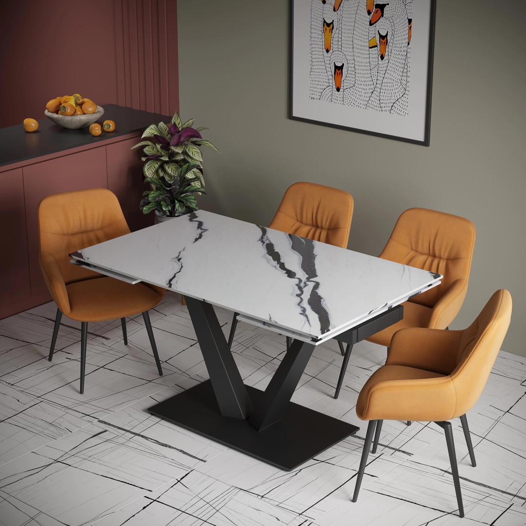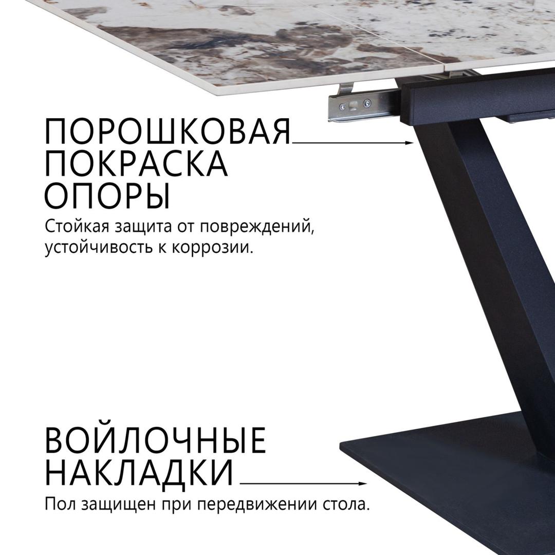 Стол с керамической столешницей «Malibu» представляет собой изысканное и функциональное обеденное место для вашего дома. Поверхность столешницы, выполненная из керамики, обеспечивает прочность, легкость в уходе и устойчивость к царапинам и температурным изменениям. Стильное металлическое основание дарит стабильность и надежность, дополняя современный дизайн стола. Данный стол идеально подходит для семейных обедов и встреч с друзьями, создавая уютную и стильную обстановку в вашем доме. Столешница модели «Malibu» может быть как компактной по площади так и просторной благодаря наличию механизма трансформации. Сама керамическая столешница может быть выполнена в различных цветовых решениях, это подарит возможность лаконично интегрировать в модель в конкретный интерьер. h3Каркас/h3 Надежный металлический каркас стола может быть окрашен в один из цветов на выбор: черный муар / серый муар / белый муар методом порошковой покраски Опоры модели притягивают внимание своей необычной формой и четкой геометрией. Они гармонично вписываются в общую концепцию дизайна модели, подчеркивают ее основательность и монументальность. h3Столешница/h3 Столешница, выполненная из глянцевой керамической плиты толщиной 11 мм имеет ряд преимуществ: прочность: керамические столешницы обладают высокой прочностью и устойчивы к царапинам, сколам и механическим повреждениям. Они могут служить долгое время без видимых следов износа. легкость в уходе: керамическая поверхность легко моется и мало чувствительна к пятнам от пищи, жирных и кислотных веществ. это делает уход за столешницей простым и удобным. устойчивость к температурным изменениям: керамические столешницы не портятся от высоких температур, поэтому на них можно ставить горячую посуду без опасения порчи поверхности. возможность выбора дизайна: керамические столешницы доступны в разнообразных цветах, текстурах и оттенках, что позволяет подобрать оптимальный вариант для любого интерьера. гигиеничность: керамическая поверхность не впитывает запахи, бактерии, и другие микроорганизмы, что делает ее более гигиеничной в использовании. Рекомендуем использовать салфетки и подставки для посуды, чтобы на дольше сохранить идеальный внешний вид столешницы. Любые загрязнения необходимо протирать мягкой тряпкой и не использовать абразивные чистящие средства! h3Механизм трансформации/h3 Стол Малибу оснащен механизмом трансформации выдвижения торцевых вставок на газлифтах, перемещающихся по направляющим. Данный механизм позволяет увеличить размер столешницы на 60 см (по 30 см на каждую сторону). Распределенная нагрузка на механизм - до 100 кг. Распределенная нагрузка на выдвижную часть - до 15 кг.