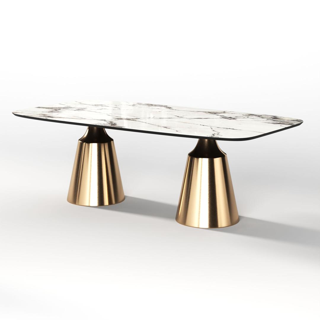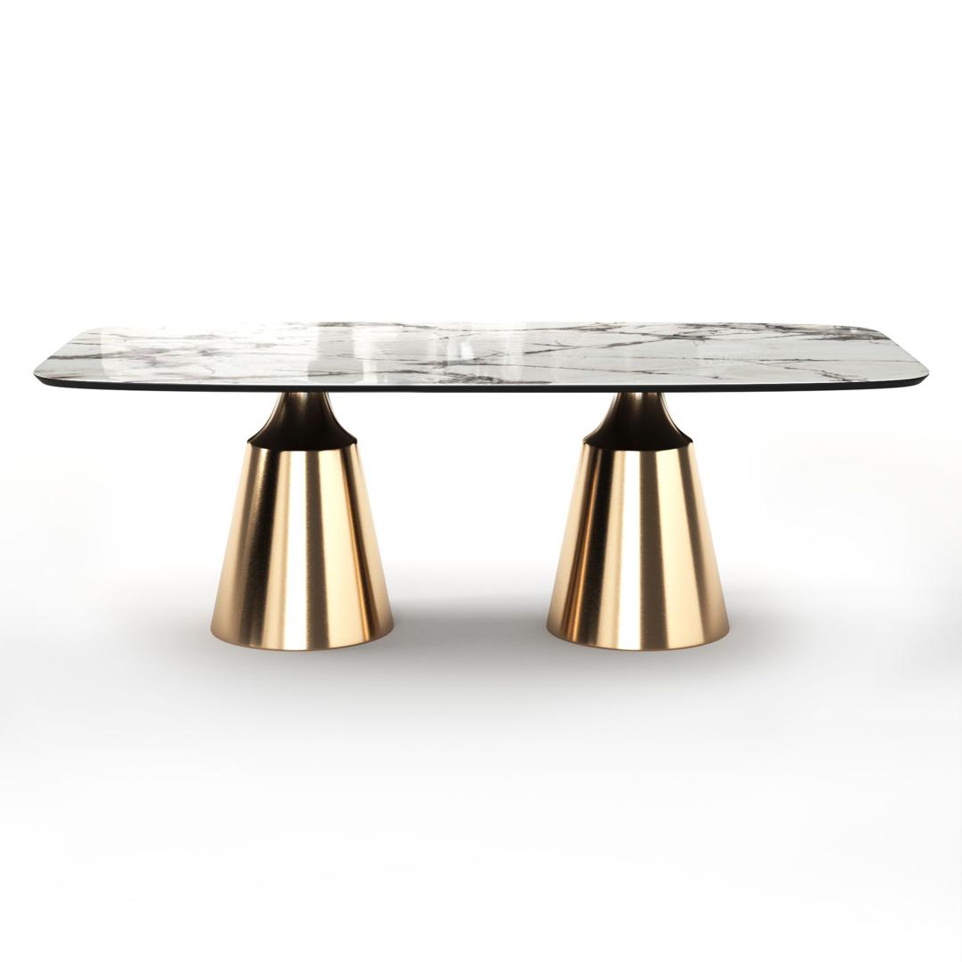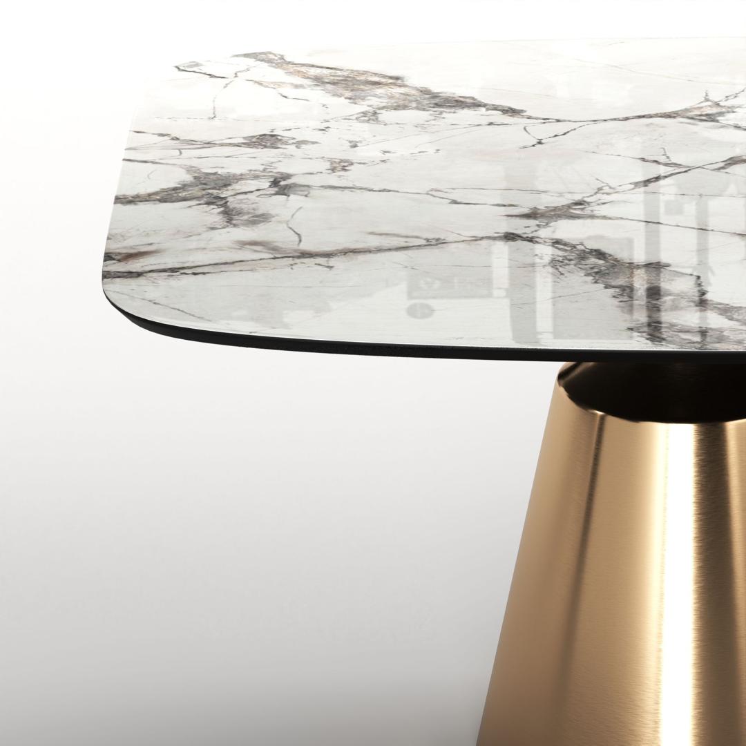 Коллекция обеденных столов Lucas - одна из самых популярных. Включает в себя различные варианты и формы обеденных столов, для персонализации своей собственной дизайнерской столовой. Основание состоит из центрального конусного ствола, выполненного из нержавеющей стали, массивный внешний вид которого облегчается металлическим покрытием нитрид титана цвет золото и соединением с узкой и отступающей столешницей, как бы напоминающей длинную элегантную шею, поддерживающую столешницу. Коллекция включает круглый, овальный, прямоугольный керамический стол Lucas с матовым или глянцевым покрытием и версию со столешницей из шпона. Столешница выполнена из МДФ 19 мм, керамика толщиной 6 мм. Ее органический и натуральный внешний вид подчеркивает путь бренда к экологичному дизайну, который создается из натуральных материалов с использованием методов с низким энергопотреблением.