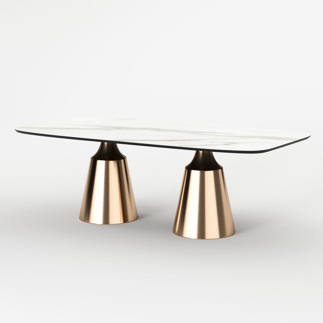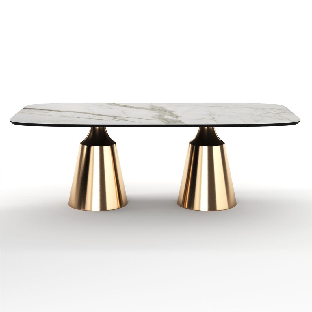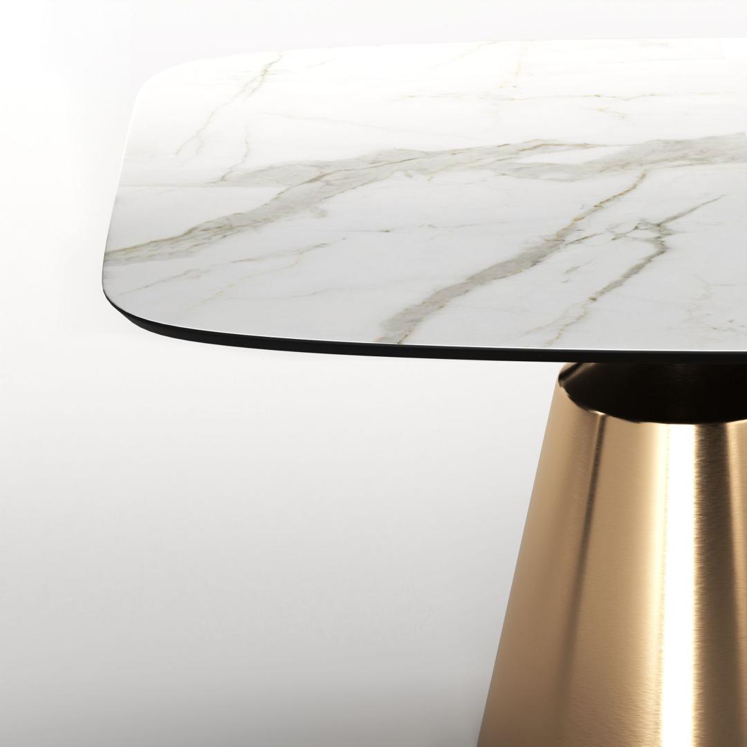 Коллекция обеденных столов Lucas - одна из самых популярных. Включает в себя различные варианты и формы обеденных столов, для персонализации своей собственной дизайнерской столовой. Основание состоит из центрального конусного ствола, выполненного из нержавеющей стали, массивный внешний вид которого облегчается металлическим покрытием нитрид титана цвет золото и соединением с узкой и отступающей столешницей, как бы напоминающей длинную элегантную шею, поддерживающую столешницу. Коллекция включает круглый, овальный, прямоугольный керамический стол Lucas с матовым или глянцевым покрытием и версию со столешницей из шпона. Столешница выполнена из МДФ 19 мм, керамика толщиной 6 мм. Ее органический и натуральный внешний вид подчеркивает путь бренда к экологичному дизайну, который создается из натуральных материалов с использованием методов с низким энергопотреблением.