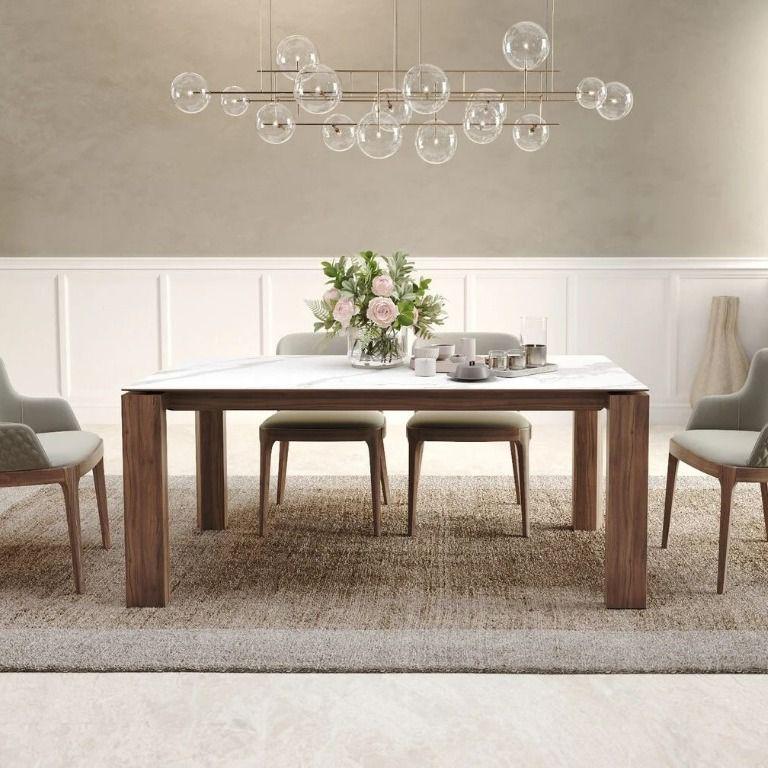 Прямоугольная форма стола Aron идеально подходит для современных интерьеров, обеспечивая достаточное пространство для комфортного размещения гостей и семейных трапез. Столешница выполнена из матовой керамики 6 мм, что придает изделию элегантный внешний вид и делает его устойчивым к царапинам и другим механическим повреждениям. Столешница также обеспечивает легкость в уходе, не требуя особых усилий для поддержания чистоты. Опора стола изготовлена из МДФ и покрыта шпоном, что обеспечивает не только прочность и долговечность конструкции, но и придает столу эстетически приятный вид, имитируя натуральную древесину.