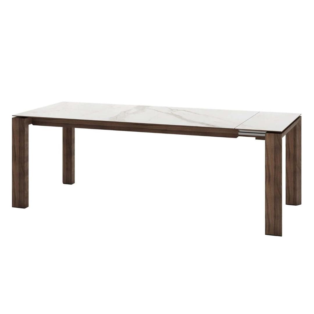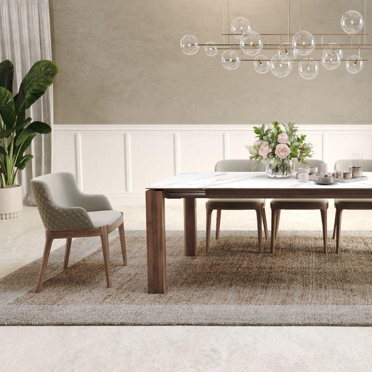 Прямоугольная форма раскладного стола Aron идеально подходит для современных интерьеров, обеспечивая достаточное пространство для комфортного размещения гостей и семейных трапез. Столешница выполнена из матовой керамики 6 мм, что придает изделию элегантный внешний вид и делает его устойчивым к царапинам и другим механическим повреждениям. Столешница также обеспечивает легкость в уходе, не требуя особых усилий для поддержания чистоты. Опора стола изготовлена из МДФ и покрыта шпоном, что обеспечивает не только прочность и долговечность конструкции, но и придает столу эстетически приятный вид, имитируя натуральную древесину.