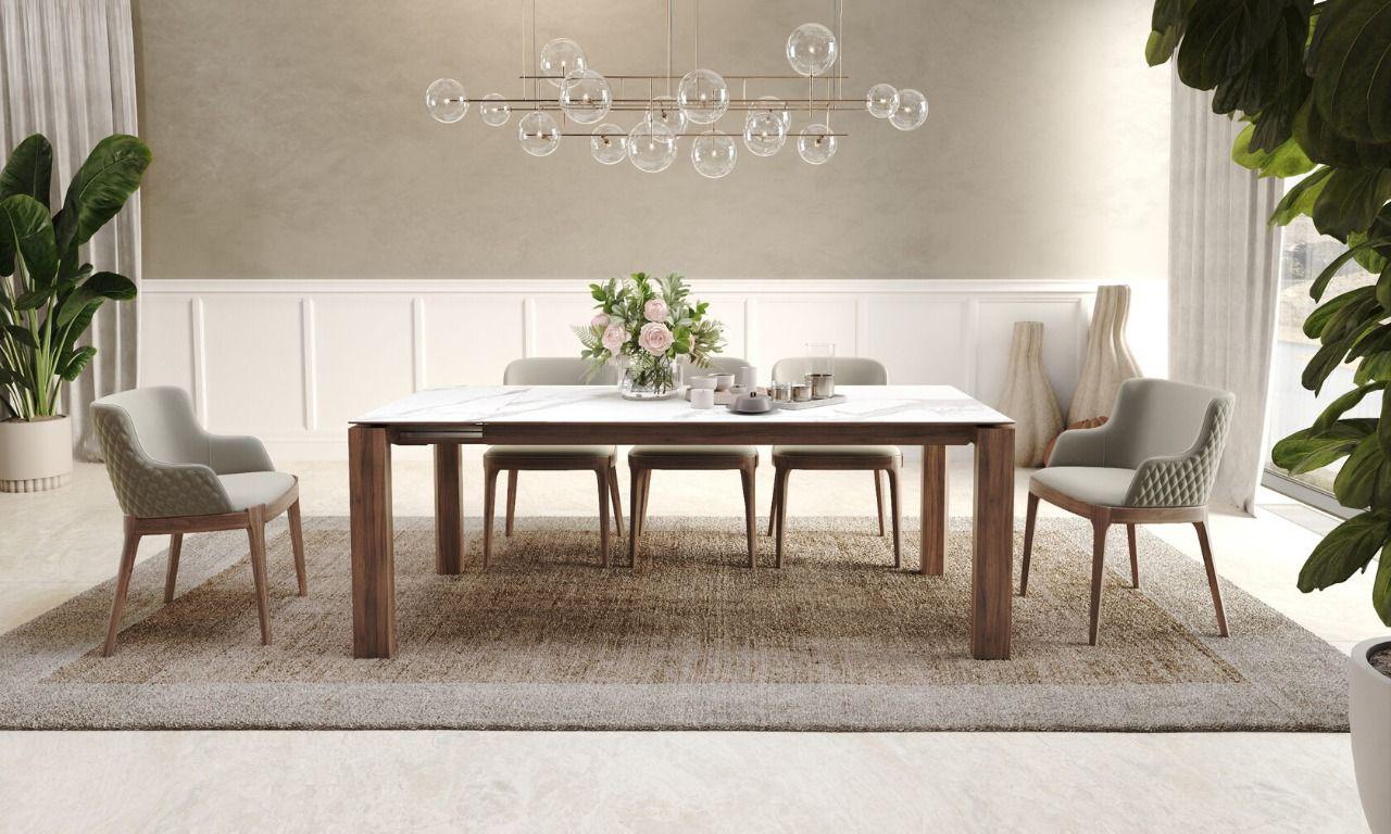 Прямоугольная форма раскладного стола Aron идеально подходит для современных интерьеров, обеспечивая достаточное пространство для комфортного размещения гостей и семейных трапез. Столешница выполнена из матовой керамики 6 мм, что придает изделию элегантный внешний вид и делает его устойчивым к царапинам и другим механическим повреждениям. Столешница также обеспечивает легкость в уходе, не требуя особых усилий для поддержания чистоты. Опора стола изготовлена из МДФ и покрыта шпоном, что обеспечивает не только прочность и долговечность конструкции, но и придает столу эстетически приятный вид, имитируя натуральную древесину.