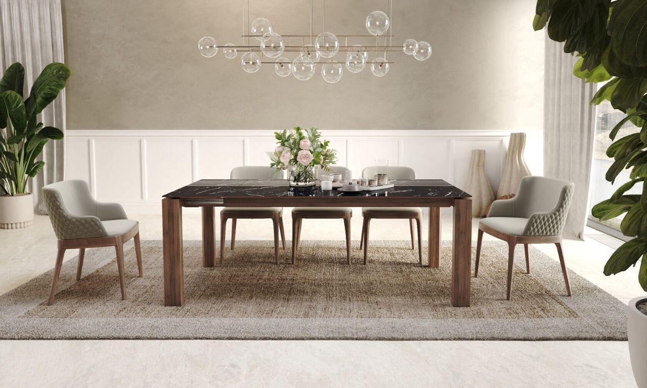 Прямоугольная форма раскладного стола Aron идеально подходит для современных интерьеров, обеспечивая достаточное пространство для комфортного размещения гостей и семейных трапез. Столешница выполнена из глянцевой керамики 6 мм, что придает изделию элегантный внешний вид и делает его устойчивым к царапинам и другим механическим повреждениям. Столешница также обеспечивает легкость в уходе, не требуя особых усилий для поддержания чистоты. Опора стола изготовлена из МДФ и покрыта шпоном, что обеспечивает не только прочность и долговечность конструкции, но и придает столу эстетически приятный вид, имитируя натуральную древесину.