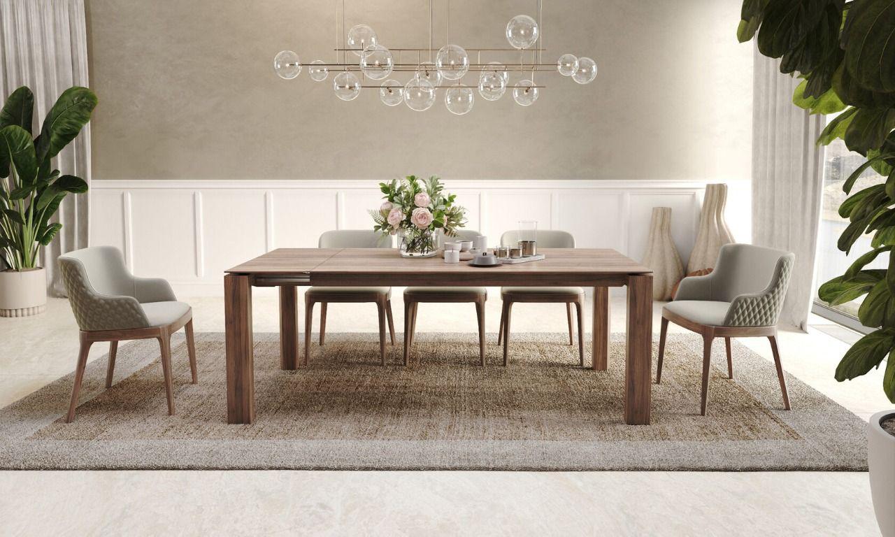 Прямоугольная форма раскладного стола Aron идеально подходит для современных интерьеров, обеспечивая достаточное пространство для комфортного размещения гостей и семейных трапез. Столешница выполнена из шпона, что придает изделию элегантный внешний вид и делает его устойчивым к царапинам и другим механическим повреждениям. Столешница также обеспечивает легкость в уходе, не требуя особых усилий для поддержания чистоты. Опора стола изготовлена из МДФ и покрыта шпоном, что обеспечивает не только прочность и долговечность конструкции, но и придает столу эстетически приятный вид, имитируя натуральную древесину.