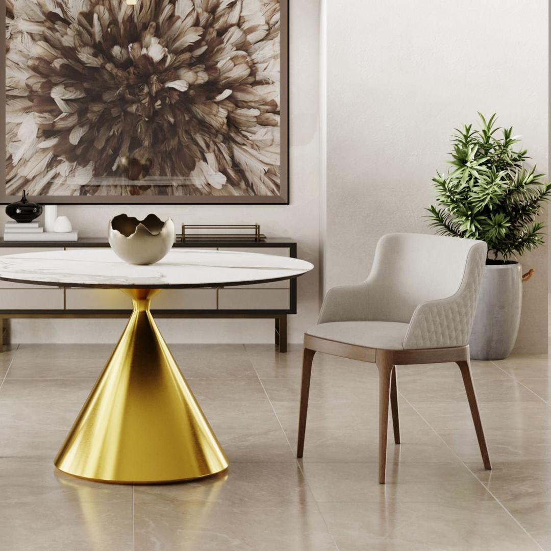 Круглый стол AXIS идеально подходит для создания уютной обеденной зоны в вашем доме или ресторане. Его дизайн и функциональность обеспечивают комфортное пространство для обеденной зоны и встреч с друзьями. Благодаря надежным материалам и качественной конструкции, этот стол будет служить вам долгое время и радовать вас своей эстетической привлекательностью. Стол с круглой столешницей AXIS не раскладывающийся, МДФ 40 мм с керамикой 6 мм. Опора стола выполнена в форме конуса и изготовлена из прочного металла. Цвет опоры - золото, что придает столу современный и стильный вид. Черный цвет добавляет элегантности и характера столу, при этом легко сочетается с различными интерьерными стилями.