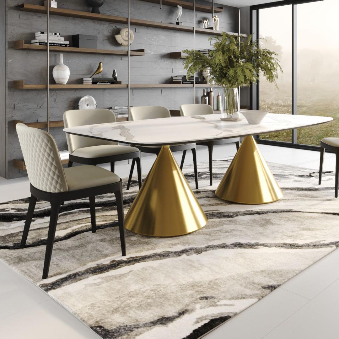 Овальный стол AXIS идеально подходит для создания уютной обеденной зоны в вашем доме или ресторане. Его дизайн и функциональность обеспечивают комфортное пространство для обеденной зоны и встреч с друзьями. Благодаря надежным материалам и качественной конструкции, этот стол будет служить вам долгое время и радовать вас своей эстетической привлекательностью. Стол с овальной столешницей не раскладывающийся, МДФ 19 мм с керамикой 6 мм. Опоры стола выполнены в форме конуса и изготовлена из прочного металла. Цвет опоры - золото, что придает столу современный и стильный вид.