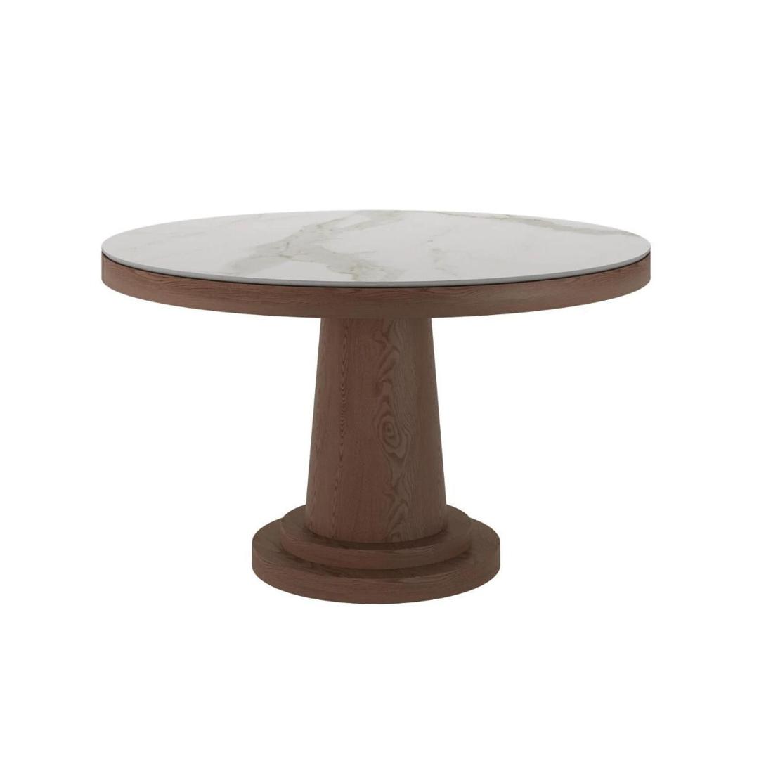 Стол с круглой столешницей, не раскладывающийся , представляет собой элегантное и удобное решение для обеденной зоны. Столешница выполнена из матовой керамики 6 мм, что придает ей стильный и современный вид. Опора стола выполнена из МДФ с натуральным шпоном, что придает конструкции прочность и устойчивость. Этот стол сочетает в себе функциональность, качество материалов и стильный дизайн, что делает его идеальным выбором для обеденной зоны вашего дома или кафе. Он станет уютным и привлекательным акцентом в любом интерьере..