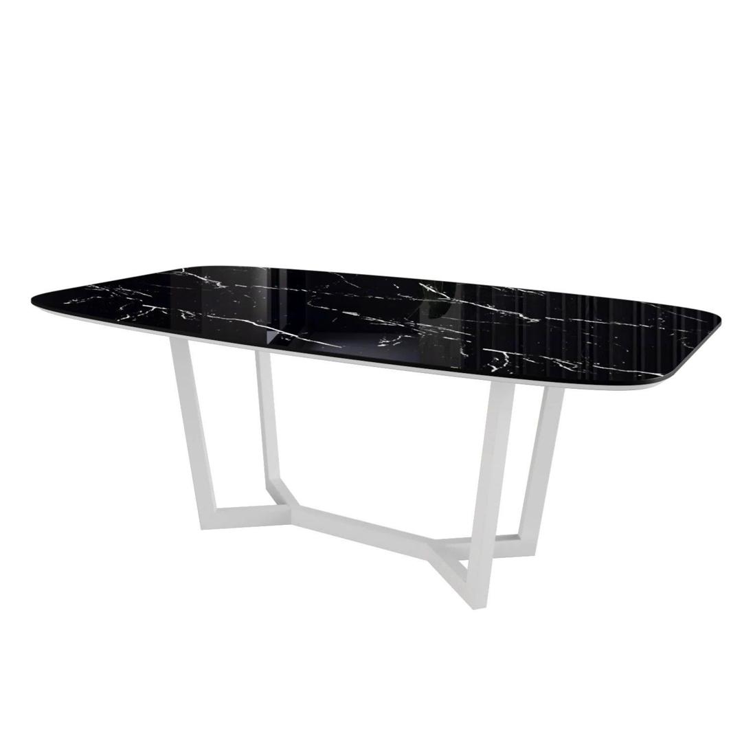 Овальный стол BENZ - отличается своей дизайнерской опорой и изысканной керамической столешницей. Керамическое покрытие стола не боится влаги, устойчиво к перепадам температур, на нем можно резать продукты без использования кухонной доски. Рисунок каждой столешницы уникален. Черный вариант имеет светлые вкрапления и линии. В хаотичных узорах можно найти разнообразные формы, либо воспринимать их как абстракции. За данным столом легко поместится 6 человек. Опора привлекает своей оригинальностью. Также она сделана из стали - это долговечный и крепкий материал.