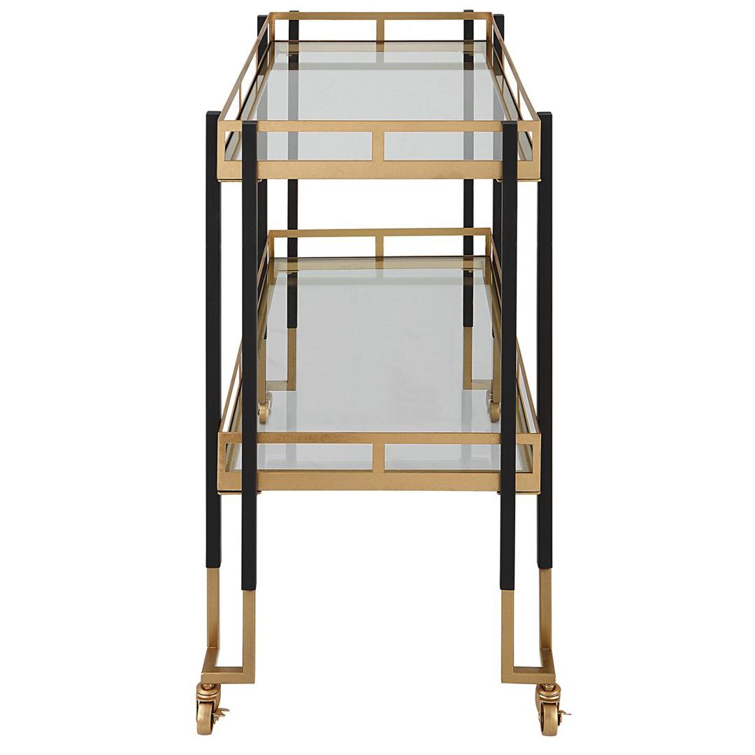 Прекрасный сервировочный столик, выполненный в современном стиле. Такой стол сумеет вписаться практически в любой интерьер и будет отлично смотреться даже в небольшом помещении. Стол изготовлен из железа и выполнен в двухцветной отделке - черное с золотом. Оснащен двумя полками из закаленного стекла и роликами с фиксаторами