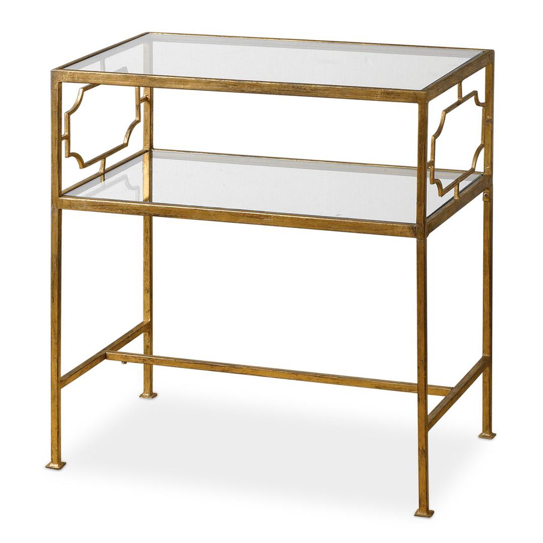 Чудесный приставной столик, выполненный в современном стиле. Каркас стола изготовлен из кованного железа в отделке античным листовым золотом, столешница и полка же выполнены из стекла. Такой стол несомненно придется по вкусу многим и станет отличным приобретением.