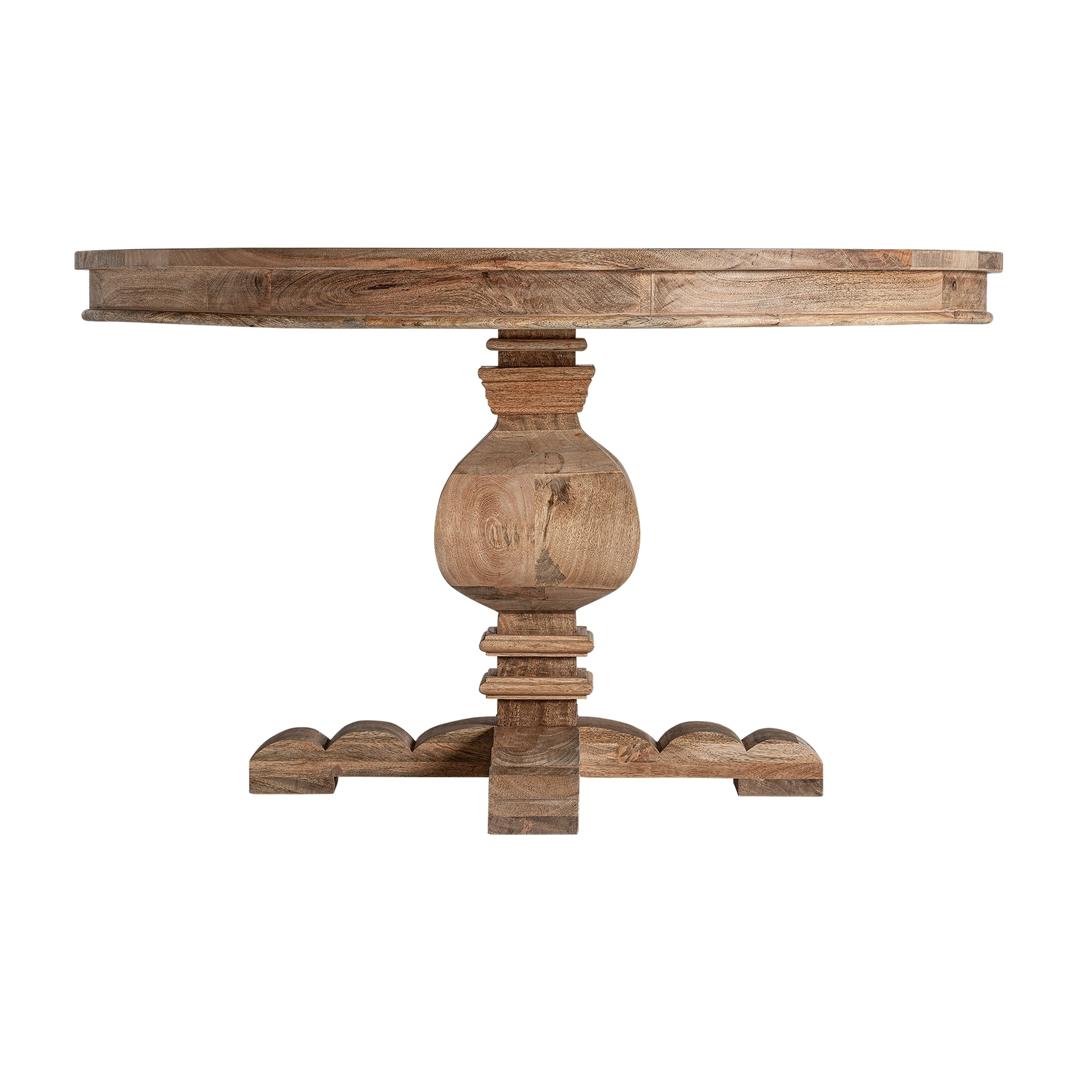 Обеденный стол Kehrig – это дань традициям и домашнему теплу. Этот традиционный круглый деревянный стол размером 130x130x76 см изготовлен из древесины манго естественного цвета, что отражает вневременной стиль и обещает долговечность. Это идеальный центральный элемент любого семейного торжества.