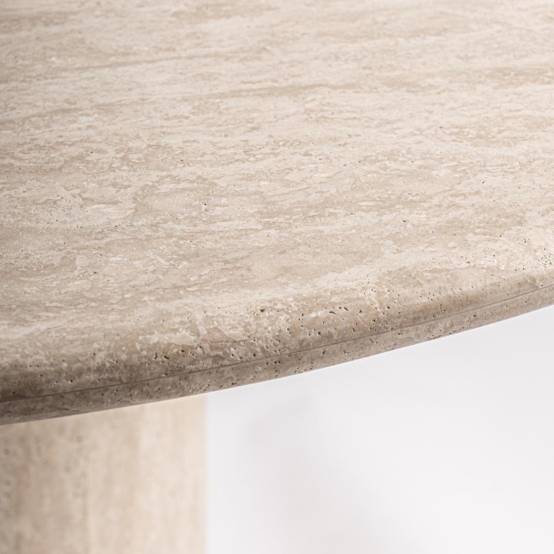 Обеденный стол из бежевого травертина. Стол изготовлен из натуральных материалов, поэтому каждый из них будет эксклюзивным, со своими уникальными оттенками и текстурами. Пористость и неоднородность материала не считаются браком Ширина: 160 см, Глубина: 160 см, Высота: 76 см