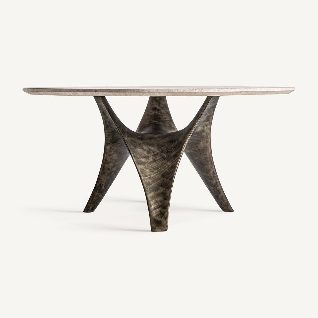 Обеденный стол Laize от VICAL, изготовленный из бежевого травертина и состаренной позолоченной стали, производит сильное впечатление. Металлическое основание создаёт контраст, а поверхность из натурального камня излучает солидность и элегантность. Ширина: 150 см, Глубина: 150 см, Высота: 75 см