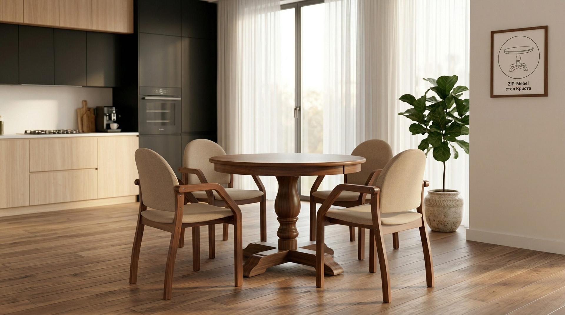 Стол «Криста» — это идеальное сочетание традиционного стиля и современной практичности для вашего дома.Комбинированные материалы — сочетание натурального дерева и качественного МДФ обеспечивает превосходный внешний вид и долговечность конструкцииБлагородный дизайн — оттенок орех, изящная точёная ножка-пьедестал и крестообразное основание придают столу аристократичный вид в стиле современной классикиНадёжность — массивное основание крестообразной формы гарантирует исключительную устойчивость и безопасностьУниверсальность — идеально впишется в интерьер кухни, столовой или гостиной, дополняя как классические, так и современные направления дизайнаКриста — стол, который объединяет за ужином всю семью и создаёт атмосферу домашнего уюта!