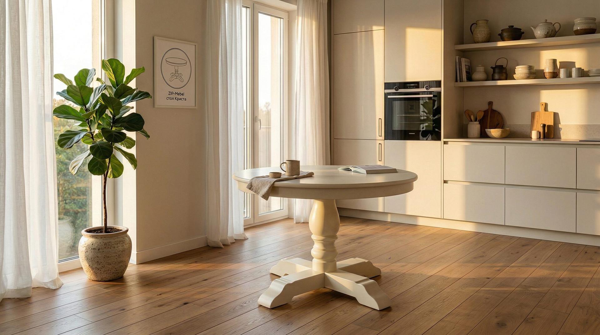 Стол «Криста» — это идеальное сочетание традиционного стиля и современной практичности для вашего дома.Комбинированные материалы — сочетание натурального дерева и качественного МДФ обеспечивает превосходный внешний вид и долговечность конструкцииРаскладная конструкция — компактный круглый стол легко превращается в просторную обеденную зону для приёма гостей. Экономия пространства без компромиссов в комфортеБлагородный дизайн — эмалевое покрытие, изящная точёная ножка-пьедестал и крестообразное основание придают столу аристократичный вид в стиле современной классикиНадёжность — массивное основание крестообразной формы гарантирует исключительную устойчивость и безопасностьУниверсальность — идеально впишется в интерьер кухни, столовой или гостиной, дополняя как классические, так и современные направления дизайнаКриста — стол, который объединяет за ужином всю семью и создаёт атмосферу домашнего уюта!