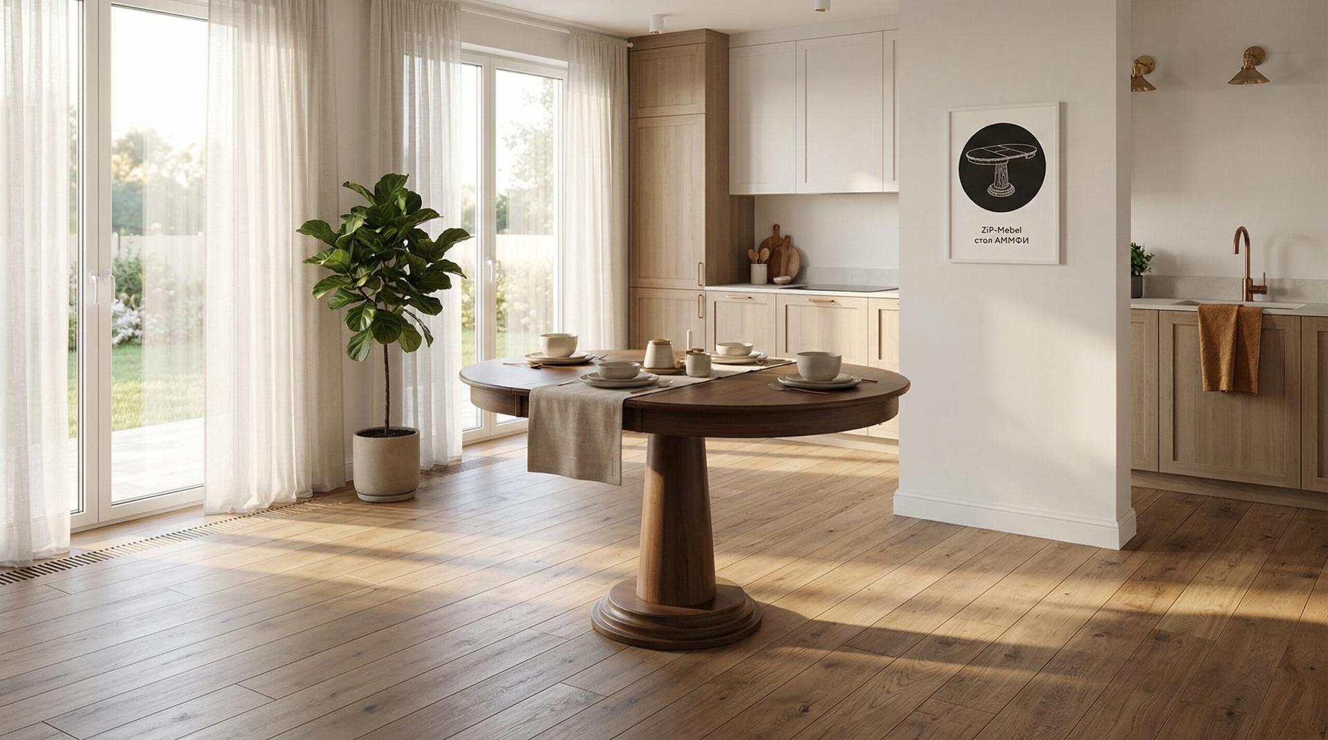 Почему стоит выбирать стол Аммфи:Натуральные материалы — столешница из массива дерева в сочетании с качественным МДФ гарантирует долговечность и благородный внешний вид на долгие годыУмная раскладная конструкция — компактный круглый стол легко трансформируется в просторную обеденную зону (+30 см) . Идеален как для повседневных завтраков, так и для семейных праздниковКлассический дизайн — благородный темный оттенок дерева и изящная тумбовая основа гармонично впишутся в любой интерьер: от классики до современного стиляНадежность — массивное центральное основание обеспечивает устойчивость, а качественная фурнитура — легкость трансформацииАммфи — это не просто стол, это центр притяжения вашей кухни, где собираются самые теплые семейные моменты!
