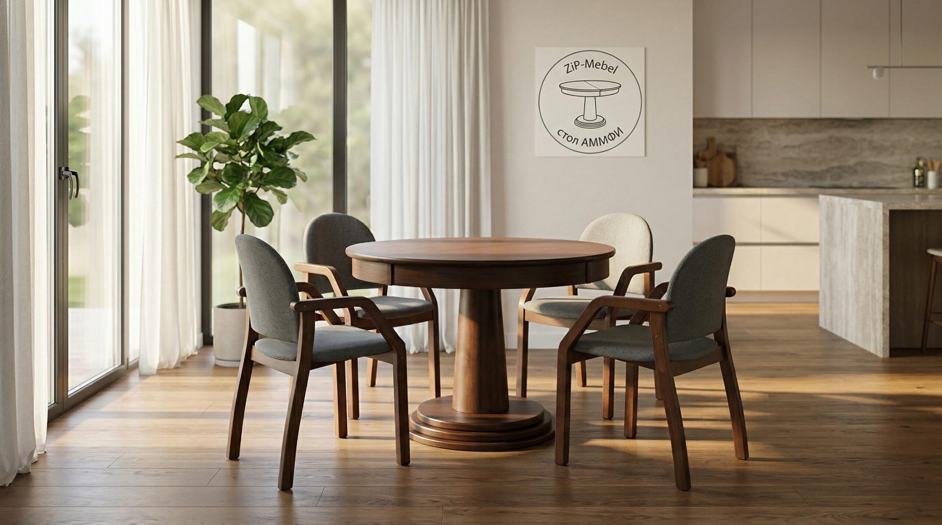 Почему стоит выбирать стол Аммфи:Натуральные материалы — столешница из массива дерева в сочетании с качественным МДФ гарантирует долговечность и благородный внешний вид на долгие годыУмная раскладная конструкция — компактный круглый стол легко трансформируется в просторную обеденную зону (+30 см) . Идеален как для повседневных завтраков, так и для семейных праздниковКлассический дизайн — благородный темный оттенок дерева и изящная тумбовая основа гармонично впишутся в любой интерьер: от классики до современного стиляНадежность — массивное центральное основание обеспечивает устойчивость, а качественная фурнитура — легкость трансформацииАммфи — это не просто стол, это центр притяжения вашей кухни, где собираются самые теплые семейные моменты!