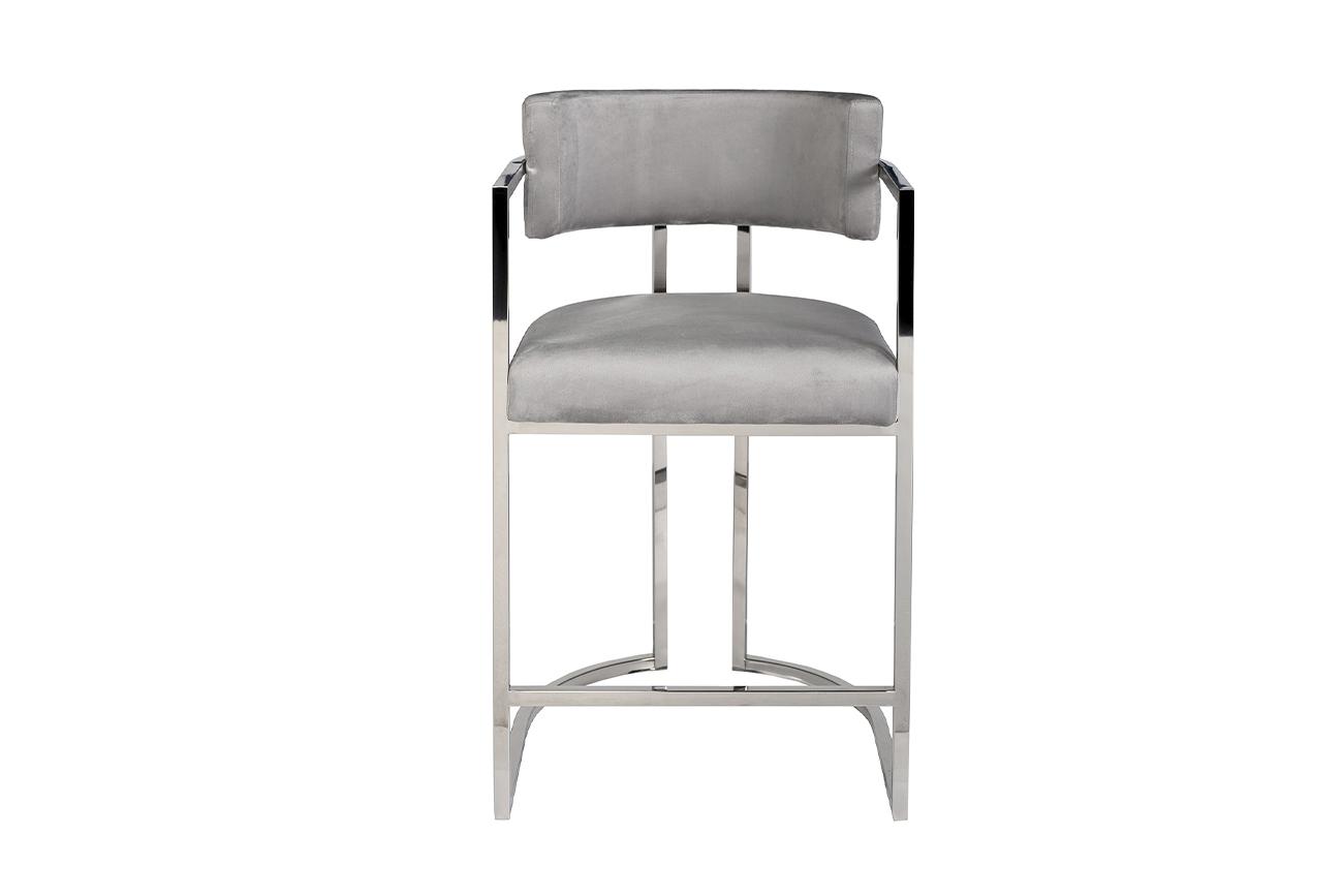 description-full - Дизайнерский барный серый стул с велюровой обивкой – стильное решение для обеденной зоны, кухни, столовой, студии с барной стойкой. Он прекрасно впишется в современные интерьеры ар-деко, минимализм, авангард, неоклассика, лофт, фьюжн. Сочетание дорогого велюра и блестящего металла придает модели особенного шика. При этом барный стул на металлическом каркасе весьма удобный в эксплуатации за счет небольшой спинки, подлокотников и ступеньки для ног. Компания Garda Decor предлагает купить велюровый барный стул с доставкой, а также другую первоклассную мебель и предметы декора в стилистике современного ар-деко. Глубина сиденья 50см, высота от пола 60см