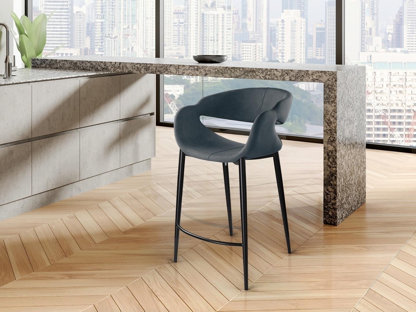 Высокий табурет. Обивка из 100% полиэстера тёмно-синего цвета с декоративной строчкой. Химчистка. Металлические ножки и подставка для ног с матово-чёрным покрытием. Сиденье и спинка из фанеры и поролона.