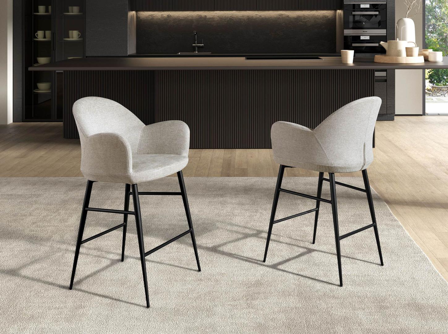 Табурет с подлокотниками в современном дизайне с сиденьем и спинкой, обитыми светло-серой тканью. Его ножки из нержавеющей стали, окрашенные в черный эпоксидный цвет, с авангардным, но вневременным стилем сделают его обязательным предметом на вашей кухне или в столовой. Этот табурет от Angel Cerdá сочетает в себе уникальный и индивидуальный стиль бренда, а также высочайший комфорт и устойчивость благодаря высокому качеству обивки и оригинальной конструкции ножек.