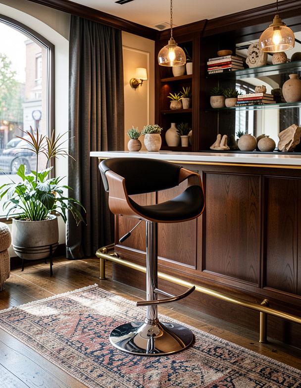 Вес, кг: 10 / Высота (см): 109 / Высота сидения (см): 64-85 / Гарантия, мес.: 12 / Глубина (см): 50 / Глубина сиденья (см): 50 / Количество коробок: 1 / Материал каркаса: сталь хромированная / Материал сидения: экокожа, клееное дерево / Минимальная высота (см): 88 / Необходимость сборки: да / Размер упаковки 1: 0,57/0,56/0,54 / Страна производитель: Китай / Цвет: орех/черный/хром / Ширина (см): 53