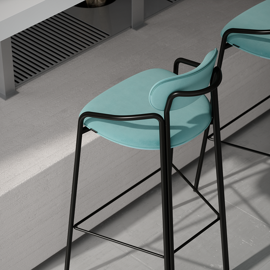 Коллекция Ror - это мебель с индивидуальным характером. Каркас барного стула Round состоит из трех стремящихся вверх элементов, которые образуют округлый, словно окутывающий корпус. За счет отсутствия прямых углов создается легкий, гармоничный силуэт. Стальное основание с порошковым покрытием делает конструкцию прочной и надежной, а мягкий велюр с бархатистой текстурой обеспечивает тактильный комфорт. Ткань обивки обладает высокими показателями износостойкости. Используемый в качестве наполнителя пенополиуретан отличается комфортной плотностью и жесткостью. Все материалы отвечают высоким стандартам практичности, долговечности и экологической безопасности. Стул украсит собой любой современный интерьер: подойдет для оформления кухни, барной зоны в кафе и ресторане. Материалы: сталь, фанера, 100% пенополиуретан, 100% полиэстер. Размеры: 54х61х100 см. Высота сиденья: 77 см. Ширина сиденья: 41 см. Глубина сиденья: 41 см. Высота спинки: 24 см. Ширина спинки: 31 см. Максимальная нагрузка: 102 кг. Цвет: черный/светло-бирюзовый. Загрязнения удалять с поверхностей мыльным раствором воды при помощи мягкой губки или салфетки.