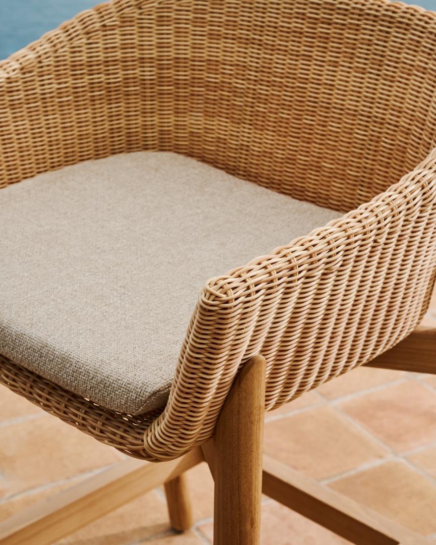 Коллекция Galea, разработанная Made Studio для Kave Home, — это дань уважения традиционному мастерству, адаптированному к современным потребностям. Каждое изделие — это идеальное сочетание эксклюзивного дизайна и функциональности, созданное на века и гармонично вписывающееся в любое пространство на улице или в помещении. Твердое дерево тикового дерева, сертифицированное FSC 100%™, не только гарантирует экологичность и ответственное лесопользование, но и дарит естественное тепло, которое подчеркивает красоту каждого изделия. Синтетический ротанг ручной работы, имитирующий плетение, обеспечивает исключительную устойчивость к атмосферным воздействиям и очень прост в уходе. Комфорт и практичность лежат в основе этой коллекции. Подушки со съемными чехлами, покрытыми сетчатой пеной, которая пропускает воду через подушку, не задерживаясь внутри, и быстро сохнет, разработаны таким образом, чтобы обеспечить комфорт пользователя, подходящего для использования на открытом воздухе. Чтобы сохранить натуральность этих изделий с течением времени, мы рекомендуем наносить средство Sterina wood protector не реже двух раз в год.