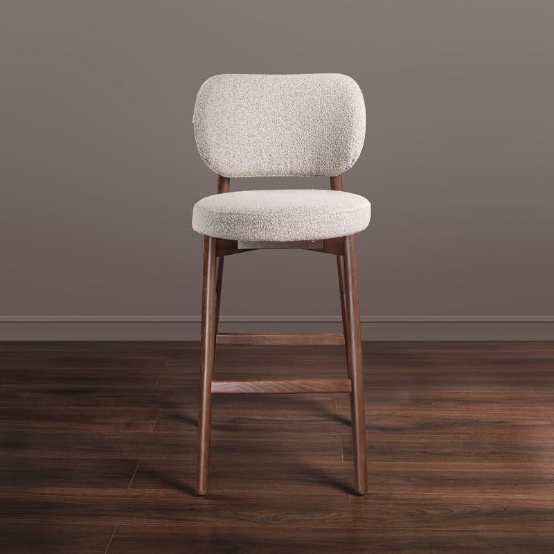 Барный стул от фабрики MOD Interiors с закругленной спинкой выполнен в современном стиле. Каркас стула выполнен из МДФ и массива бука. Ножки стула из массива бука в цвете итальянский орех, обивка ткань букле в бежевых оттенках. Наполнитель: ППУ повышенной износостойкости. Ткань букле имеет отличные показатели по износоустойчивости и плотности. Рекомендации по уходу за тканью: Сухая уборка пылесосом с мягкой щеткой; Влажная уборка микрофиброй; Беречь от прямых солнечных лучей; Не ближе 40-60 см от источников тепла; Не использовать отбеливатель; Не использовать абразивные средства.