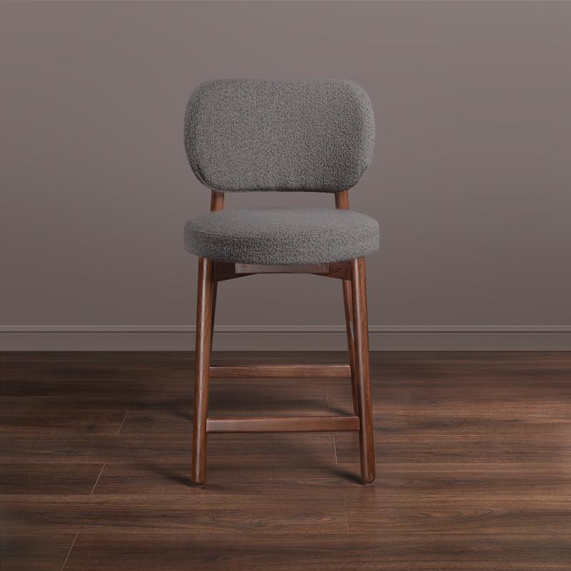 Полубарный стул от фабрики MOD Interiors с закругленной спинкой выполнен в современном стиле. Каркас стула выполнен из МДФ и массива бука. Ножки стула из массива бука в цвете итальянский орех, обивка ткань букле в серых оттенках. Наполнитель: ППУ повышенной износостойкости. Ткань букле имеет отличные показатели по износоустойчивости и плотности. Рекомендации по уходу за тканью: Сухая уборка пылесосом с мягкой щеткой; Влажная уборка микрофиброй; Беречь от прямых солнечных лучей; Не ближе 40-60 см от источников тепла; Не использовать отбеливатель; Не использовать абразивные средства.