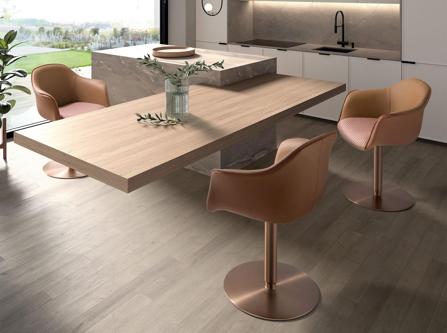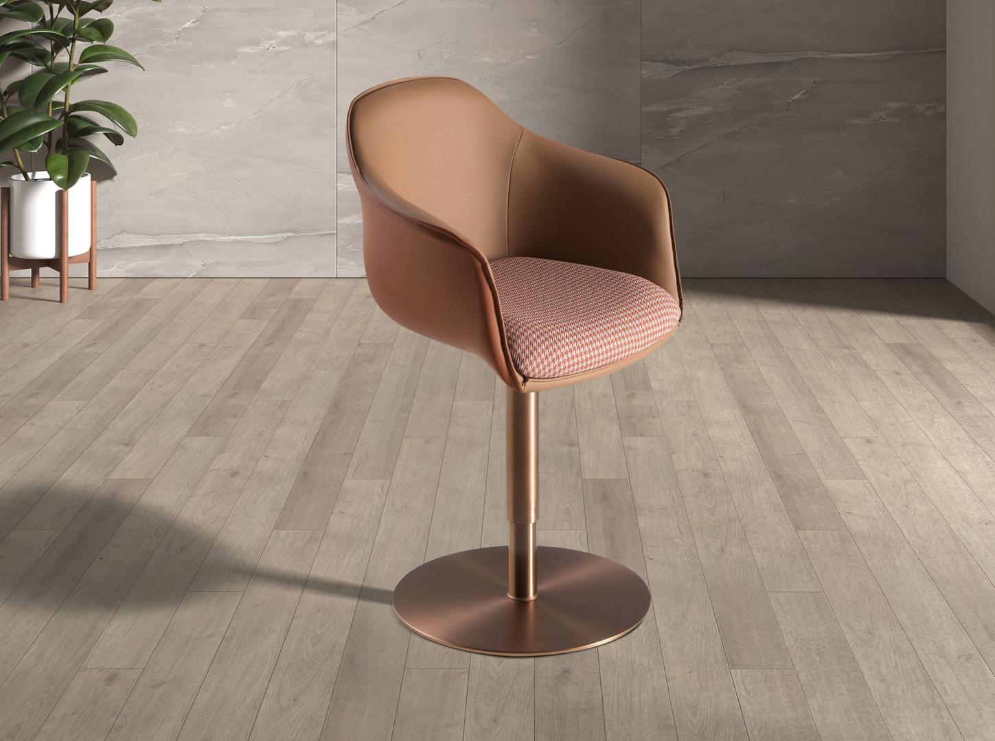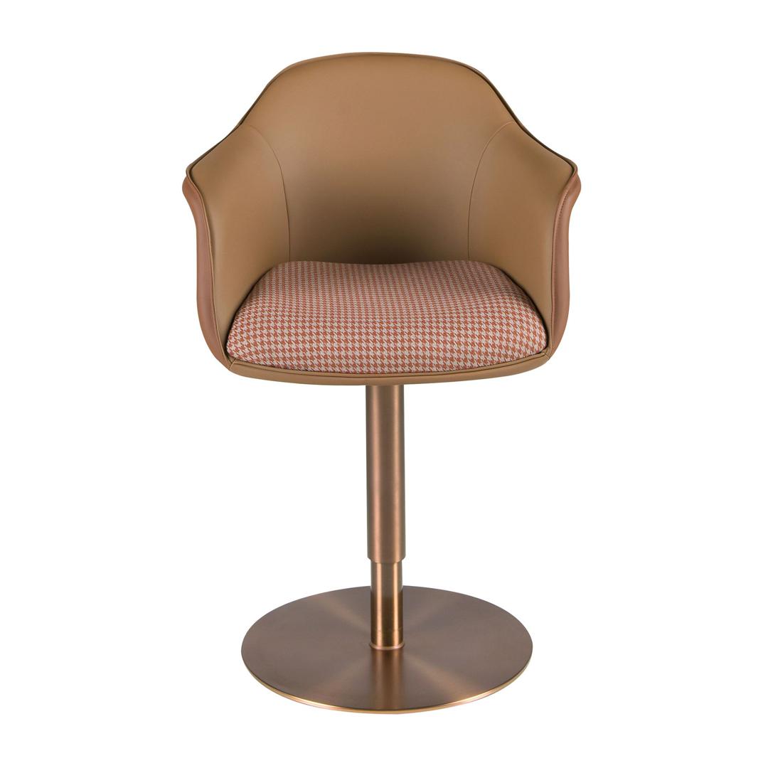 Современный поворотный стул с подлокотниками, сиденье которого обтянуто тканью терракотово-коричневого и бежевого цвета, а спинка — коричневой искусственной кожей. Полированные ножки из нержавеющей стали цвета розового золота, сочетающие в себе авангардный и вневременной стиль, сделают его незаменимым элементом вашей кухни или столовой. Этот стул от Angel Cerdá сочетает в себе уникальный и индивидуальный стиль бренда с максимальным комфортом и устойчивостью благодаря высокому качеству обивки и оригинальной конструкции ножек. Регулируемая по высоте высота сиденья позволяет адаптировать его под ваши потребности, обеспечивая больший комфорт.