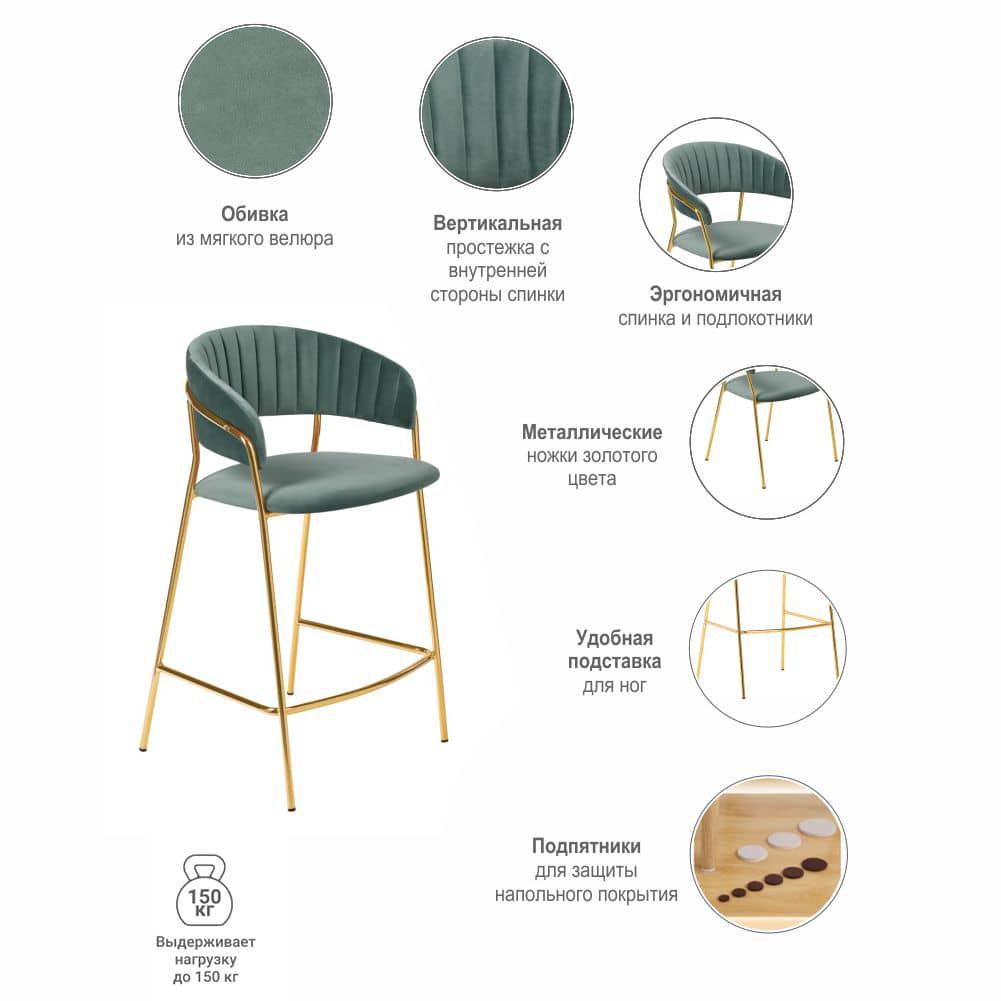 Полубарный стул Turin мятный с золотыми ножками повторяет дизайн моделей стульев Turin и Avatar, что позволяет реализовать различные пространства помещения в едином стилевом решении.