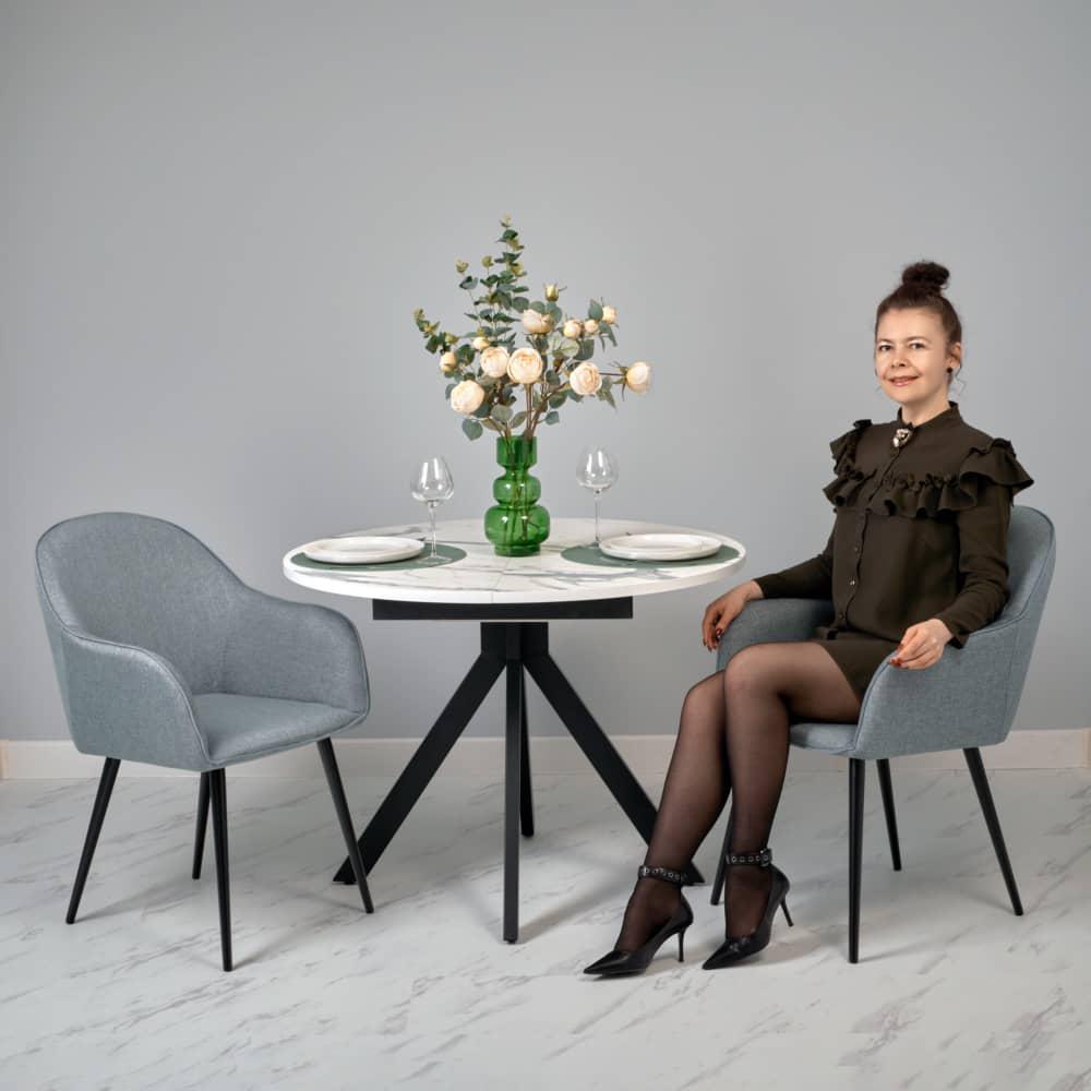Хотите купить кресло? Не спешите! Стул Frida такой же мягкий и удобный, как кресло и тоже имеет подлокотники. При этом он намного легче, мобильнее и занимает меньше места. Отличительная особенность серии в использовании удобных подлокотников и мягкой рогожки для обивки. Нейтральный серо-синий цвет подчеркнет классический интерьер. Сочетание серо-синего и черного цветов — это классика, в которой стулья для кухни или гостиной подчеркнут строгость и изысканность интерьера. А металлические ножки будут отлично сочетаться с мебелью с аналогичными ножками или фурнитурой.