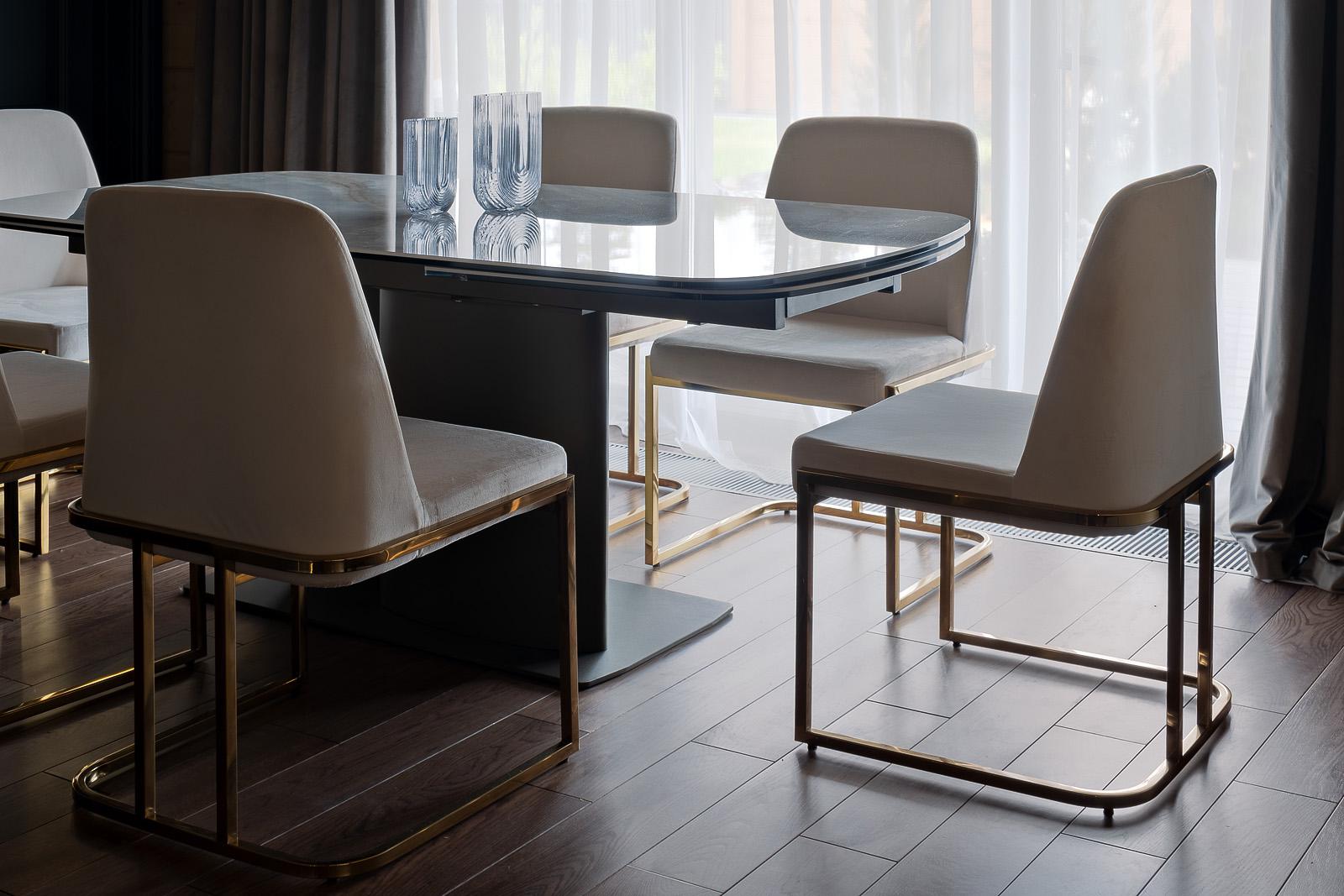 Обеденный велюровый стул воплощает в себе лучшие качества современного ар-деко - выглядит стильно, элегантно, дорого. Простые плавные симметричные линии, эргономичная форма, сочетание благородного металла в золоте с «богатым» велюром. Обеденный стол со ст...