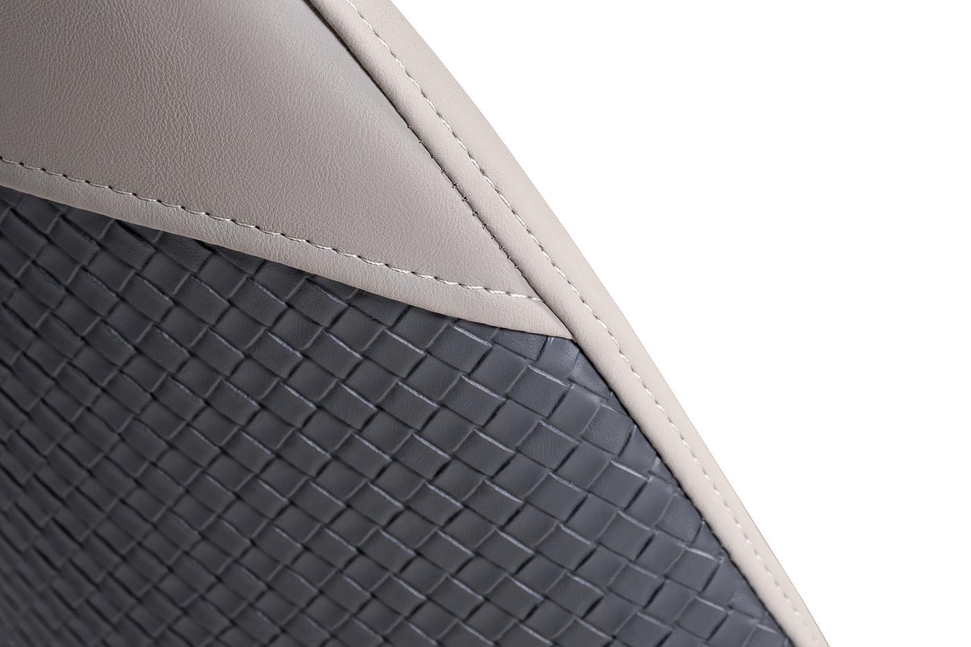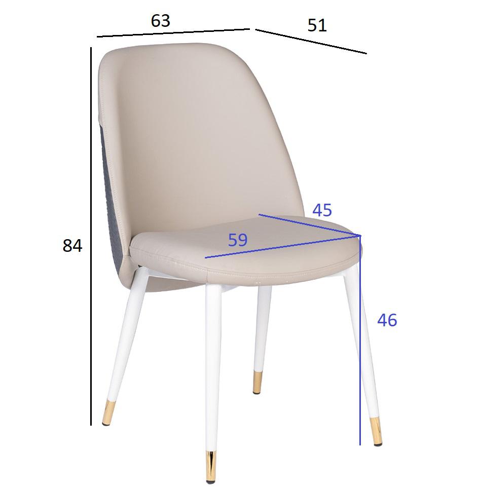 description-full - Обеденный стул из практичной экокожи красивого бежевого оттенка прекрасно впишется в кухню или столовую в светлых тонах. Спинка стула отделана темно-серой экокожей с тиснением; в комбинации с белыми ножками и золотыми наконечниками это придает стулу особый шарм и позволяет использовать его для смелых дизайнерских решений.
